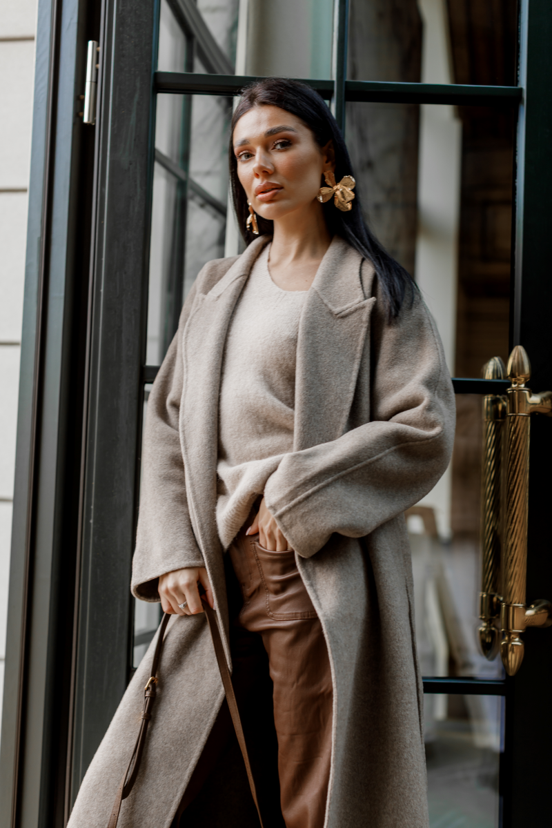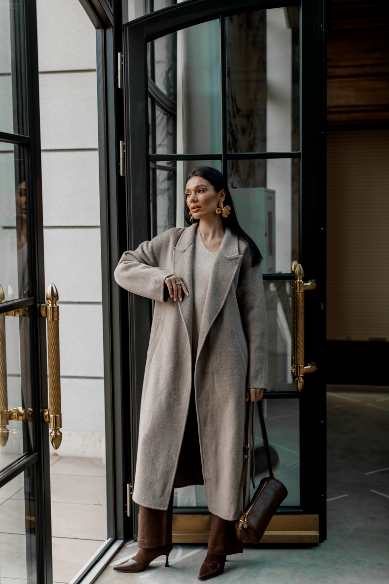 Витончене пальто в елегантному молочно-сірому кольорі — ідеальний вибір для створення стильного образу у холодний сезон. Французький виробник подбав про поєднання високої якості, комфорту та актуального дизайну. Пальто має класичний прямий крій з поясом, що підкреслює талію, а також широкі лацкани, які додають вишуканості.