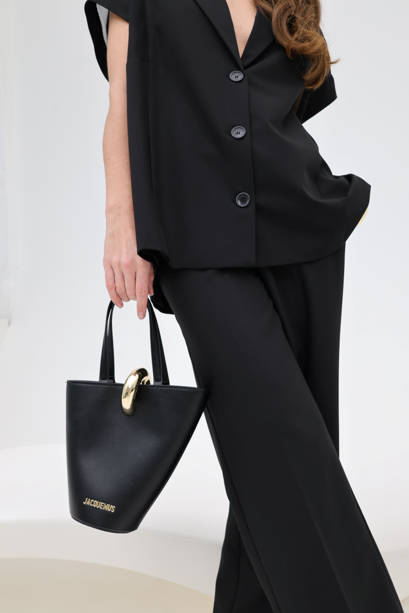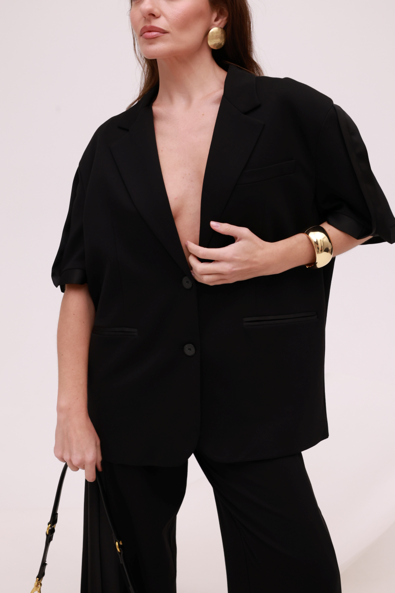 Чорний жакет IMPERIAL — це сучасна інтерпретація класичного tailoring з модним акцентом на свободу силуету. Глибокий V-виріз, м’яко спущена лінія плеча та короткий рукав створюють впевнений, але невимушений образ із легкою чуттєвістю. Тканина тримає форму, водночас залишаючись пластичною, що дозволяє жакету красиво лягати по фігурі без жорсткості. Ця модель легко працює як самостійний елемент образу, так і в парі з брюками з тієї ж лінії, формуючи елегантний монохромний сет для вечора, події або стильного міського виходу.