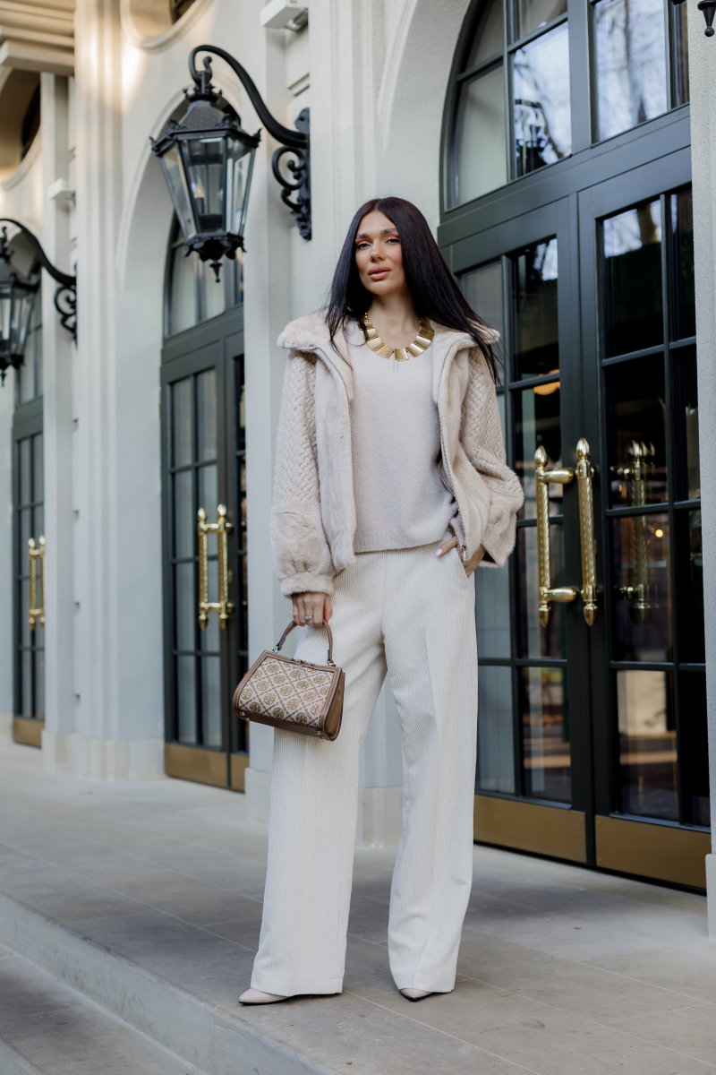 Розкішна шуба з екохутра — поєднання елегантності та етичного вибору. Надзвичайно м’яка на дотик, вона має глибокий капюшон для додаткового комфорту та захисту від холоду. Шоколадний відтінок додає образу глибини та стилю.