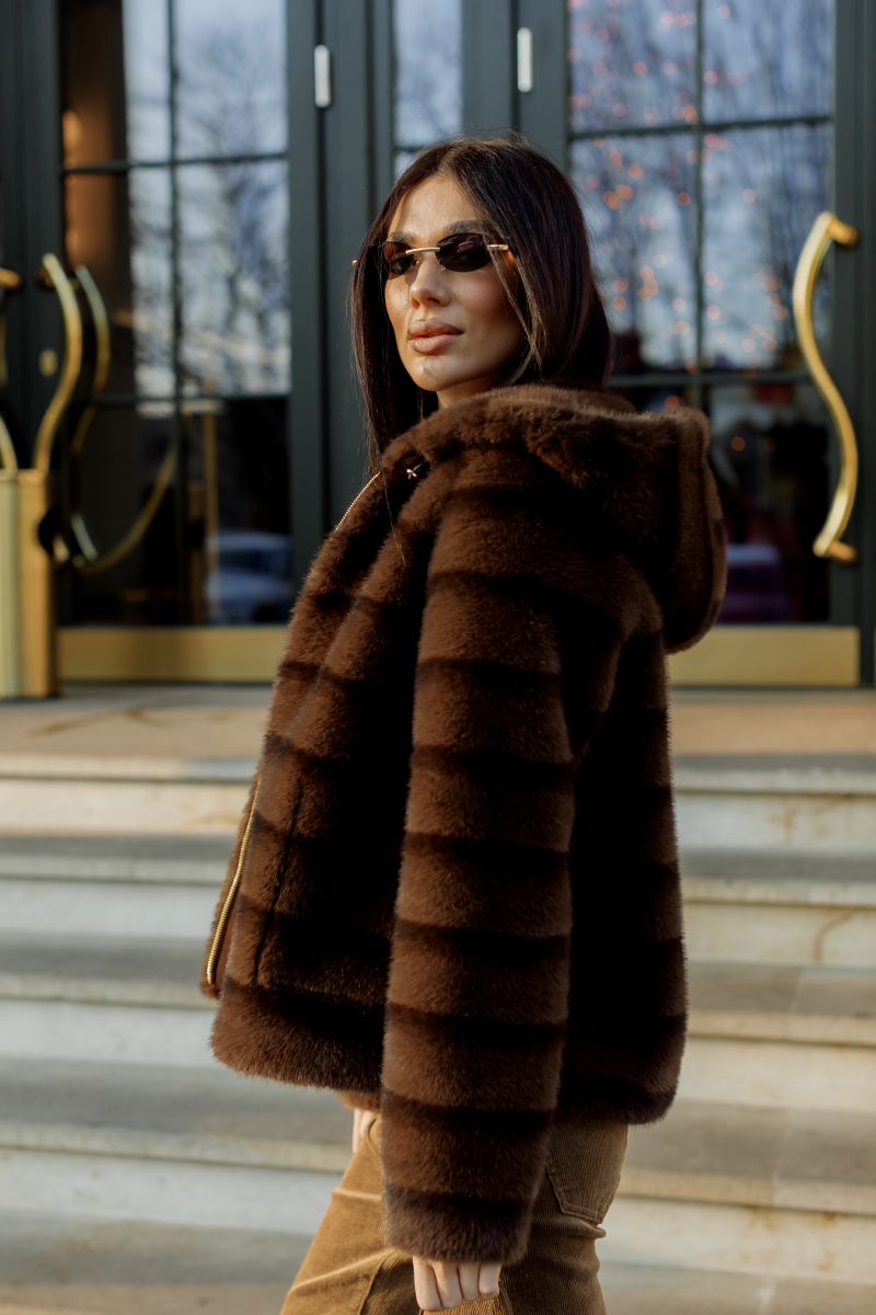 Розкішна двостороння шуба-дублянка з високоякісного екохутра у глибокому шоколадному відтінку — ідеальний вибір для стильних і практичних жінок. З одного боку — м’яке, оксамитове хутро з акцентом на горизонтальні смуги, з іншого — матова замша з хутряними вставками, що додає універсальності образу.