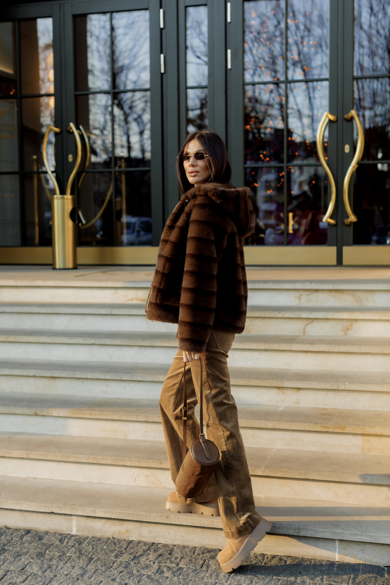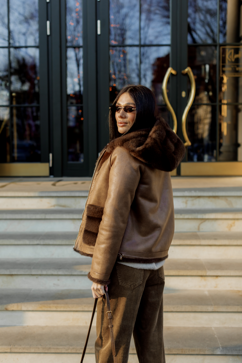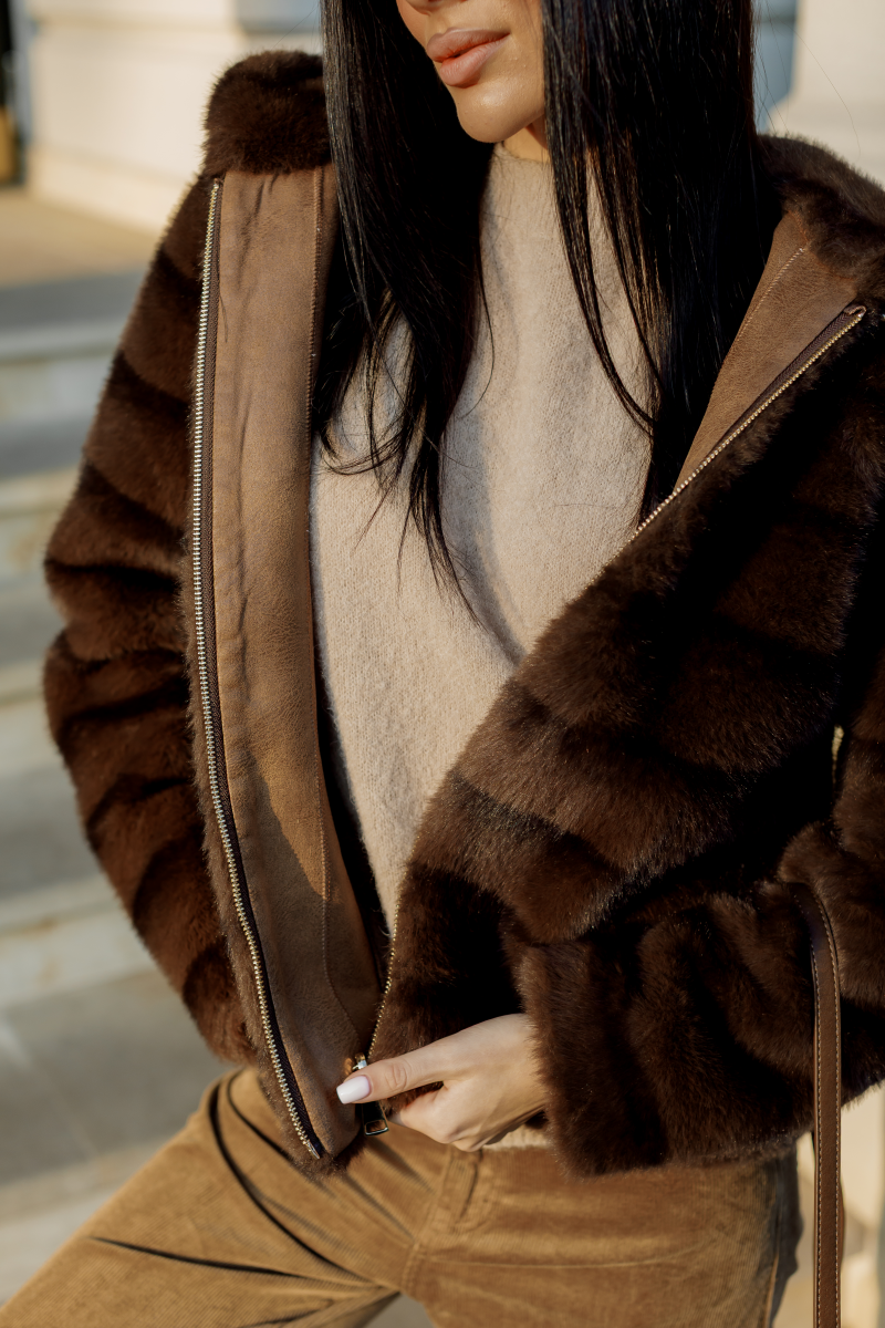 Цей верхній одяг дозволяє змінювати стиль залежно від настрою або події: хутряна сторона додає шику, замшева — підкреслює стриману елегантність.