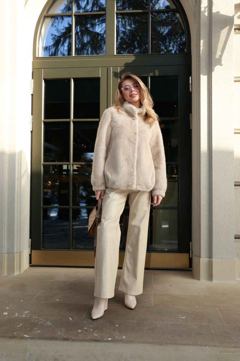 Коротка шуба виконана з високоякісного екохутра з густою, ніжною текстурою, що дарує комфорт і тепло у прохолодну пору року.