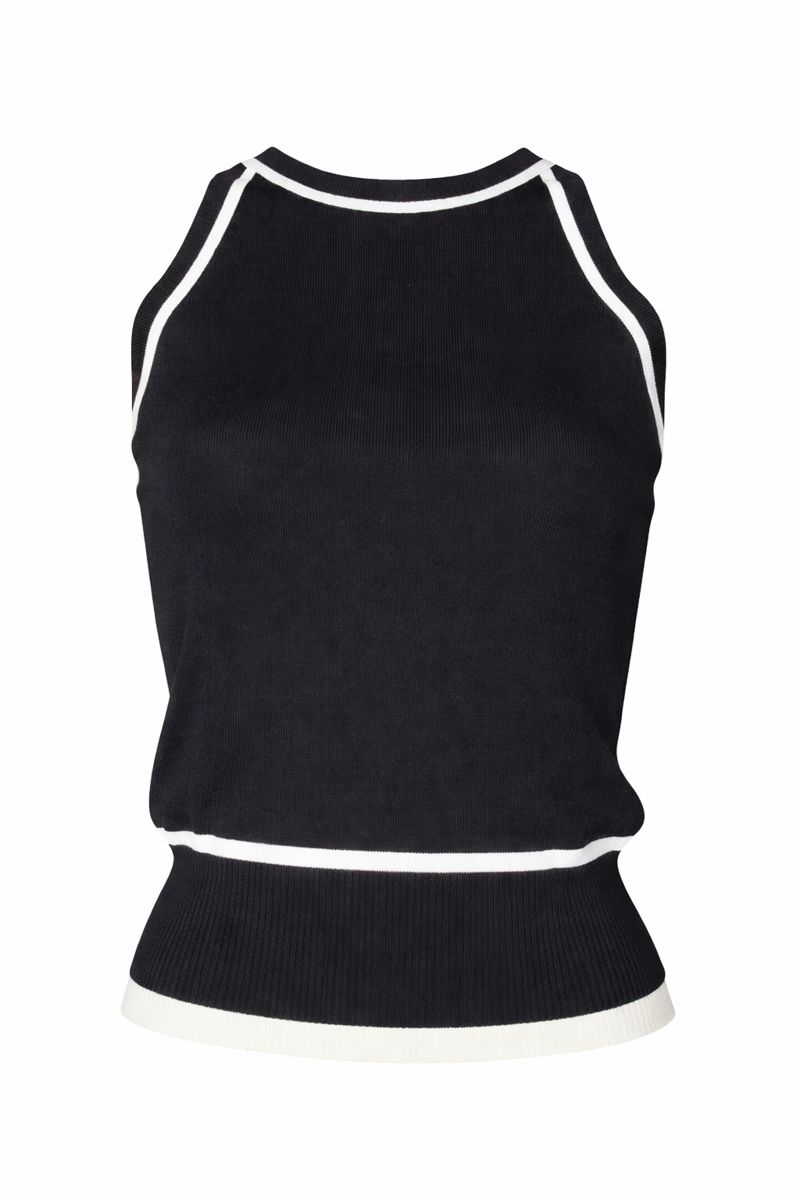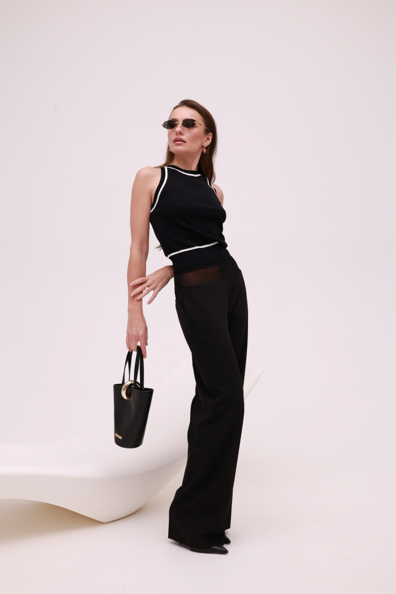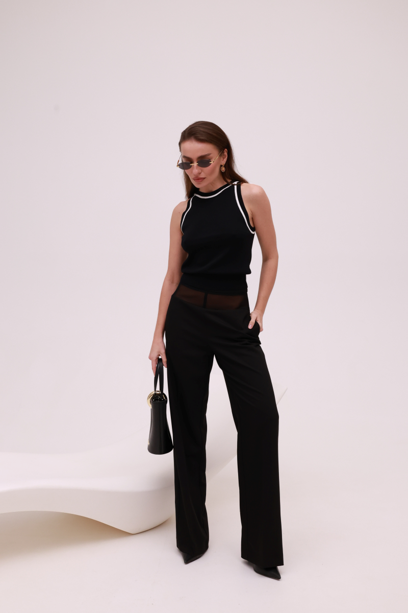 Стильний трикотажний топ від IMPERIAL виконаний у класичному чорному кольорі з контрастною білою окантовкою, що підкреслює чистоту ліній і сучасний характер моделі.