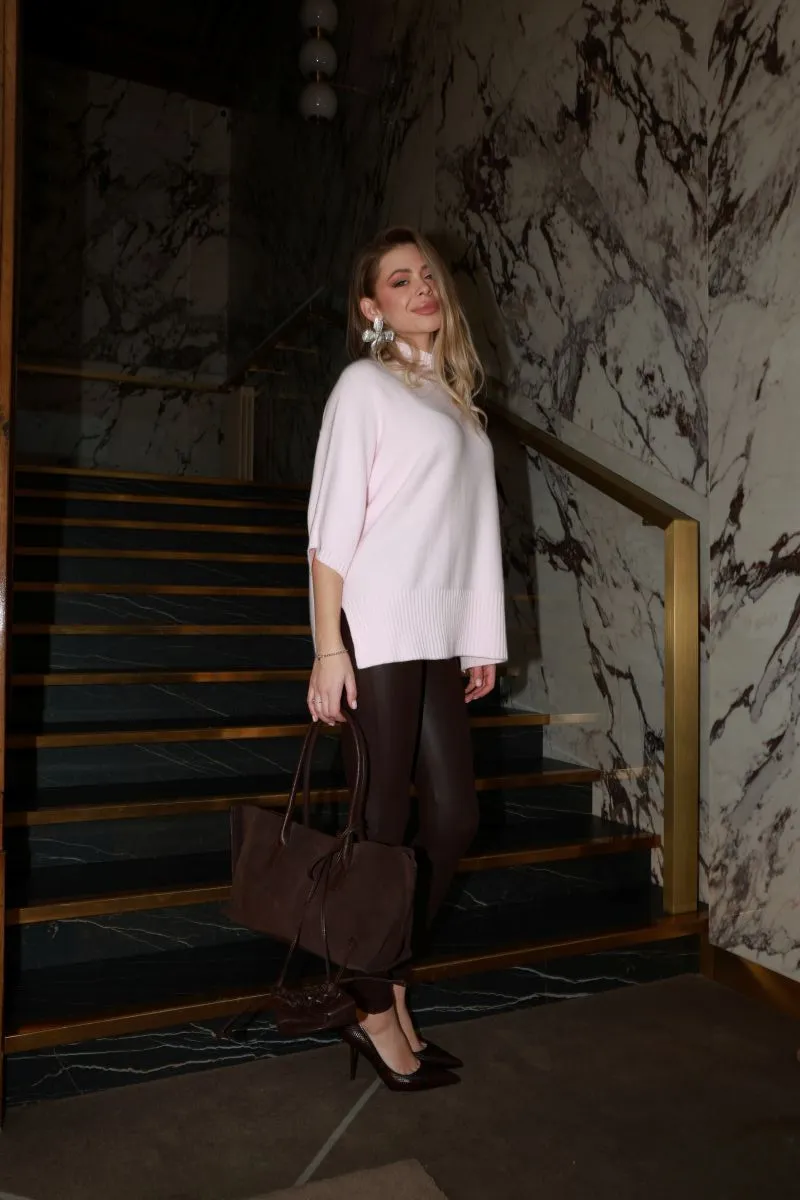 Ніжний пудрово-рожевий відтінок освіжає образ і гармонійно поєднується зі шкіряними легінсами, брюками чи спідницями.