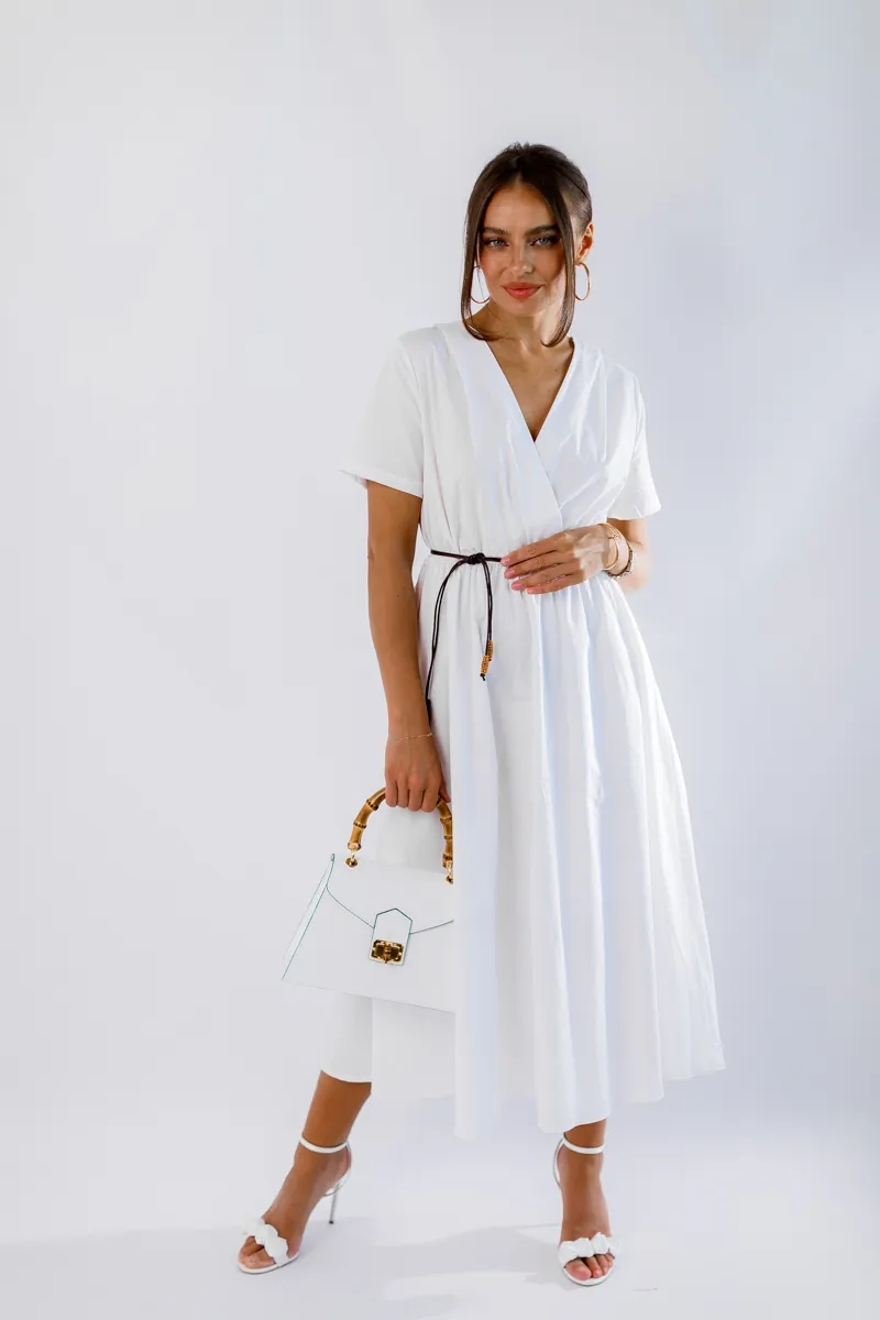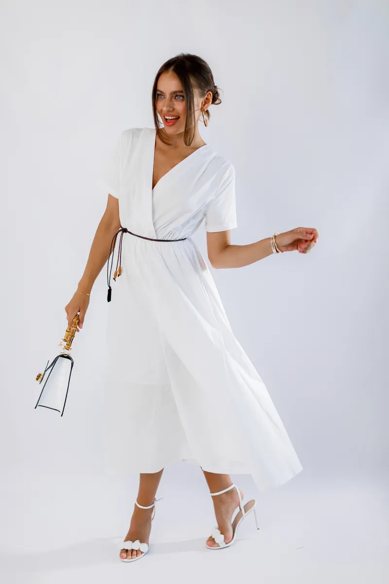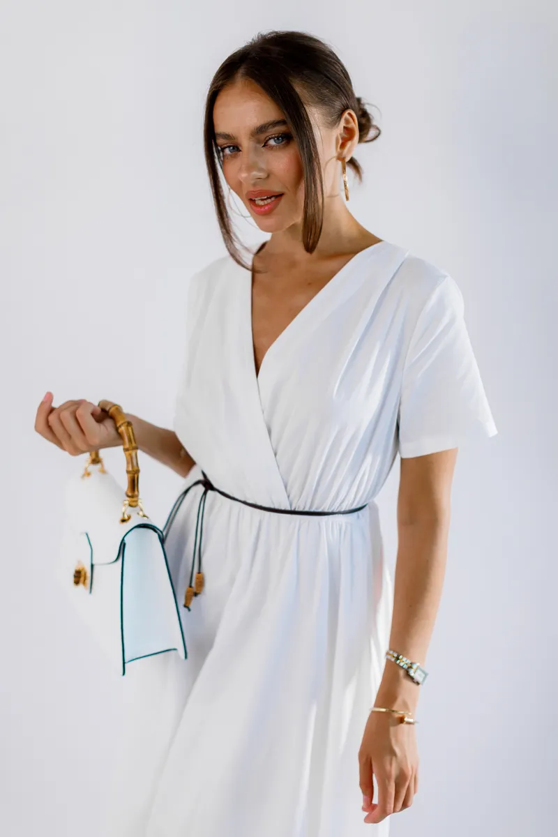 V-подібний виріз додає жіночності та елегантності, а зручна резинка на талії підкреслює фігуру і забезпечує кращу фіксацію. Ідеальна для літніх прогулянок, зустрічей з друзями або особливих подій. Білий колір робить цю сукню універсальною та легкою для поєднання з іншими елементами гардеробу.