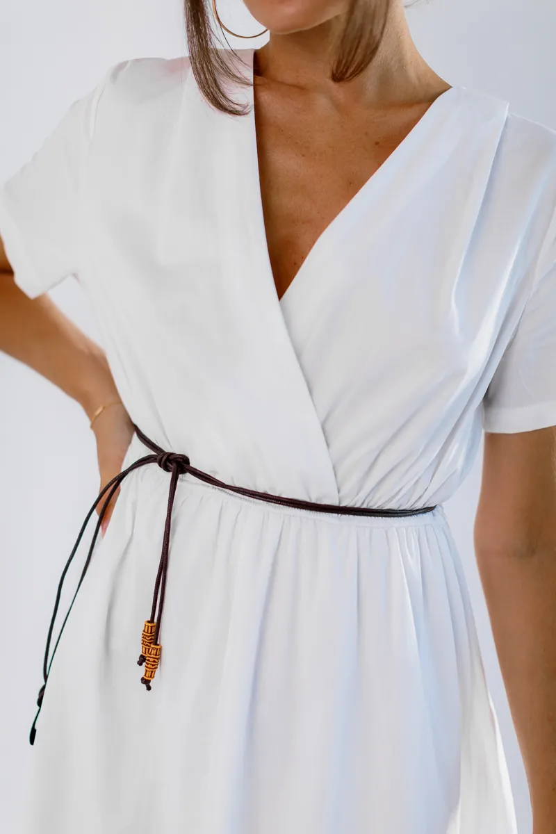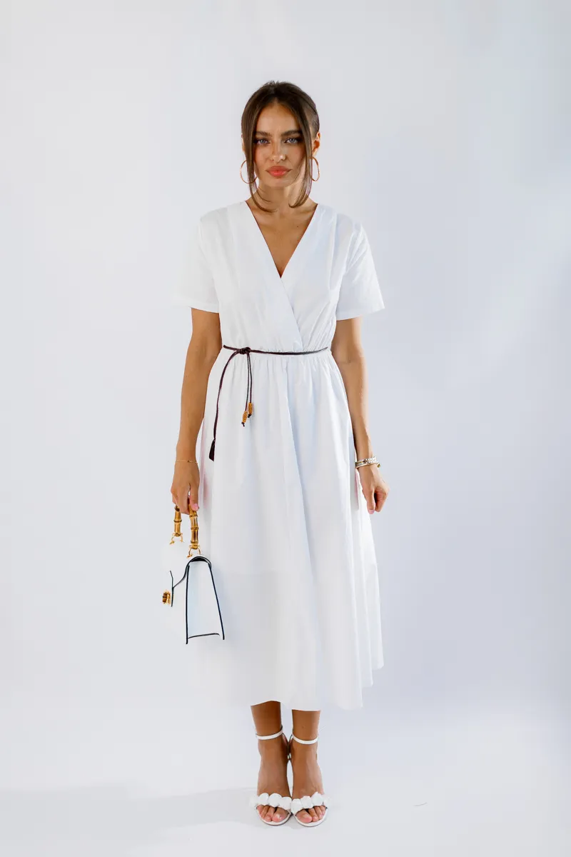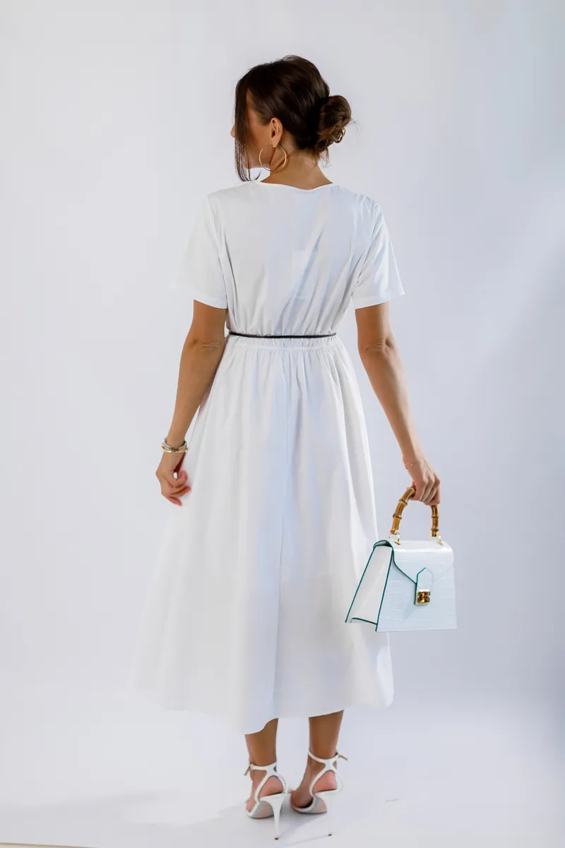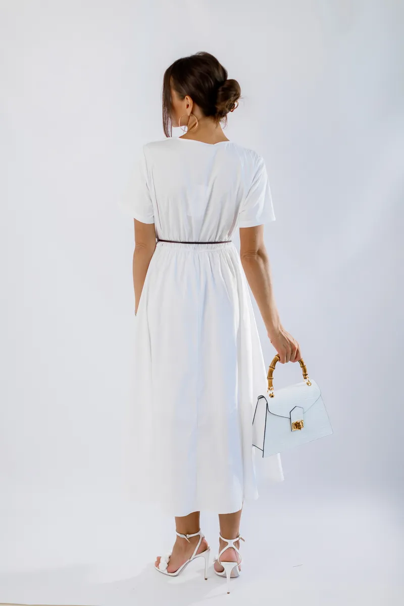 V-подібний виріз додає жіночності та елегантності, а зручна резинка на талії підкреслює фігуру і забезпечує кращу фіксацію. Ідеальна для літніх прогулянок, зустрічей з друзями або особливих подій. Білий колір робить цю сукню універсальною та легкою для поєднання з іншими елементами гардеробу.