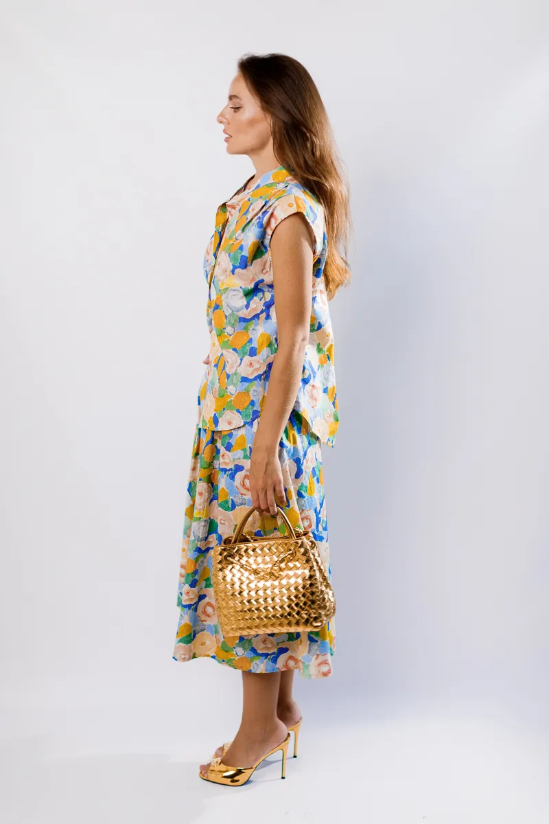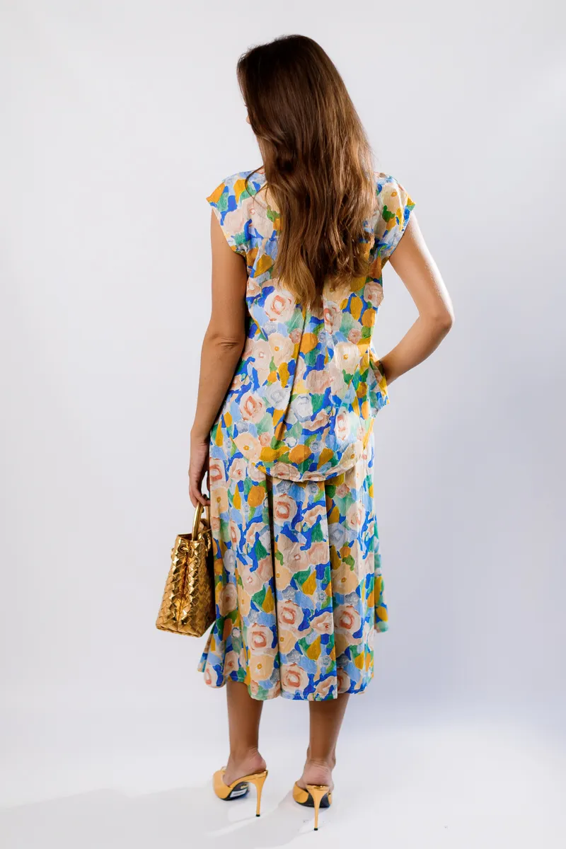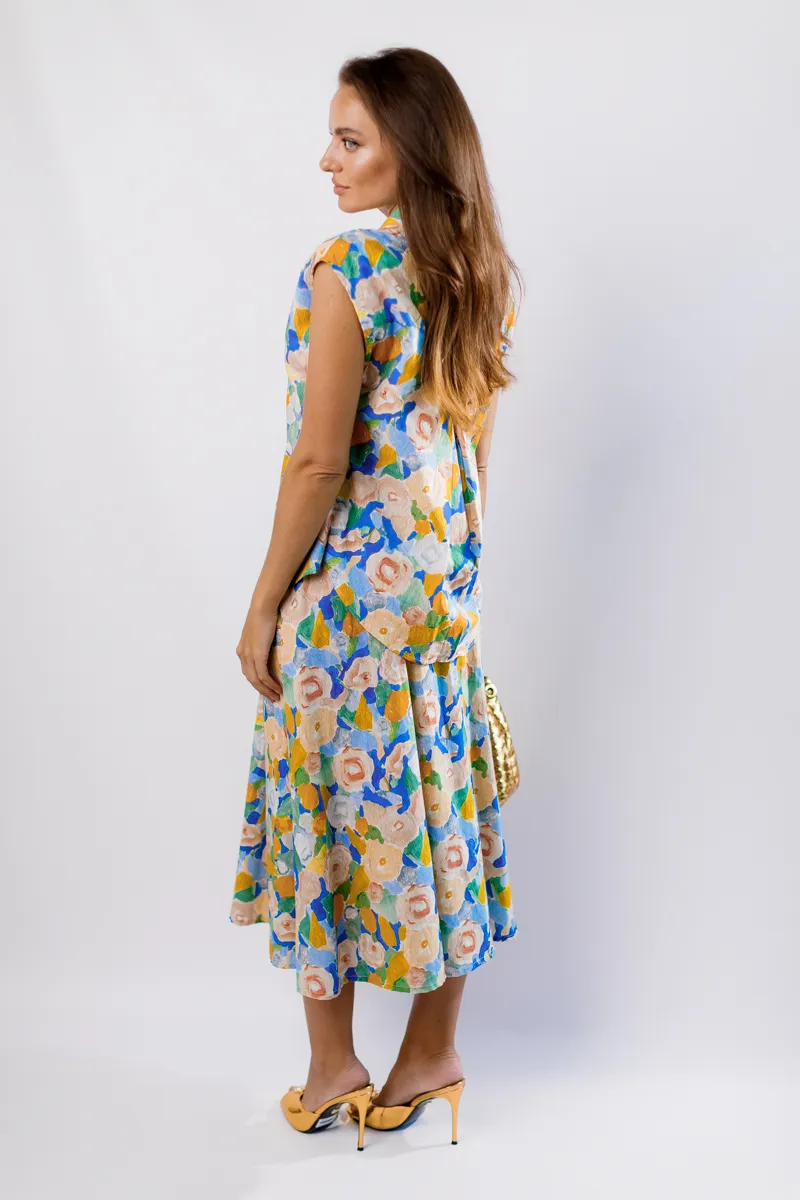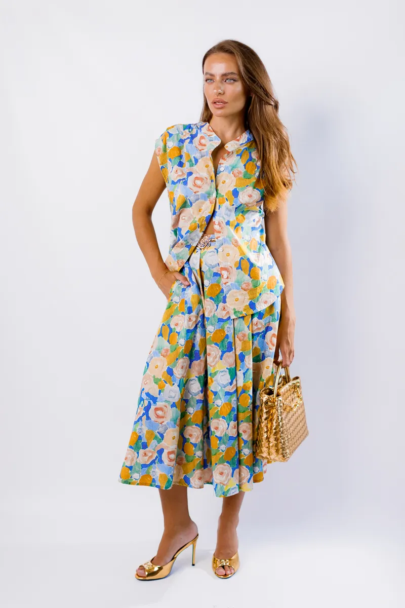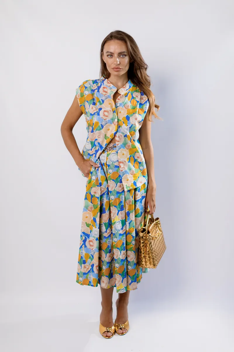 Цей елегантний костюм від італійського бренду IMPERIAL складається зі спідниці з високою посадкою та сорочки з комірцем. Костюм виконаний з високоякісних матеріалів, що забезпечує комфорт і стиль. Спідниця фасону трапеція довжини міді додає витонченості, а сорочка з комірцем створює завершений образ. Яскравий жовтий колір з квітковим принтом робить цей костюм ідеальним вибором для літніх прогулянок, зустрічей з друзями або особливих подій, додаючи вашому образу свіжості та елегантності.