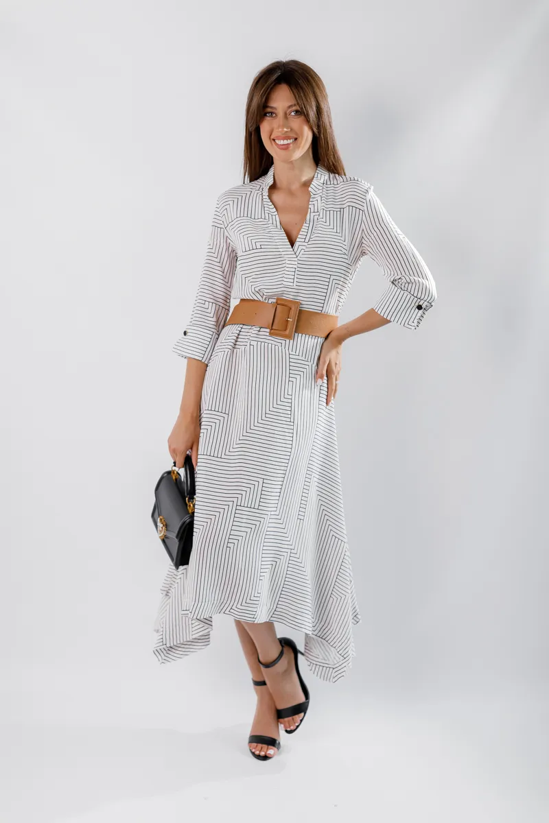 Рукава 3/4, комірець та асиметричний крій роблять цю сукню унікальною та виразною. Яскравий пояс кольору кемел підкреслює талію та додає оригінальності.