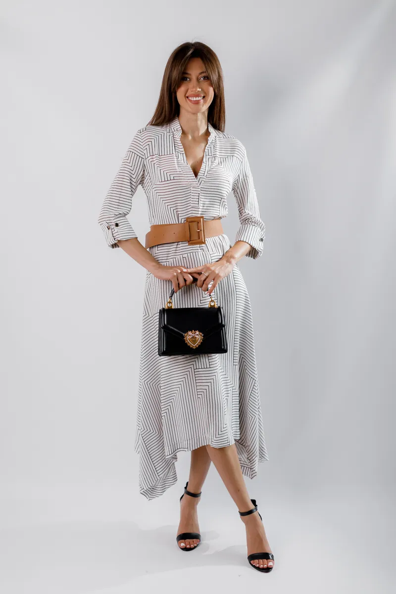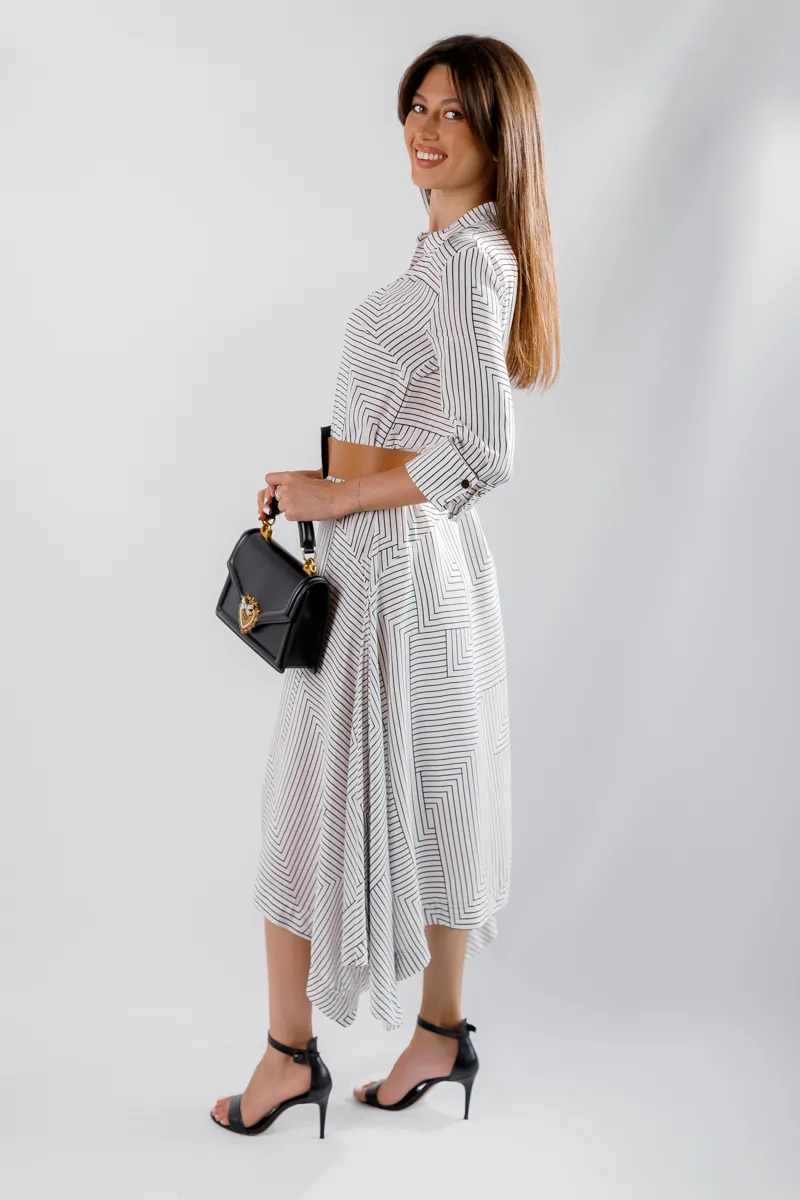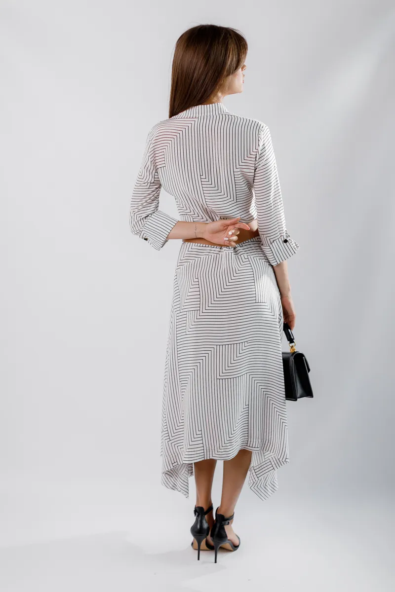 Ця сукня має стильний дизайн з білими та чорними смужками, що додають образу сучасності та елегантності.