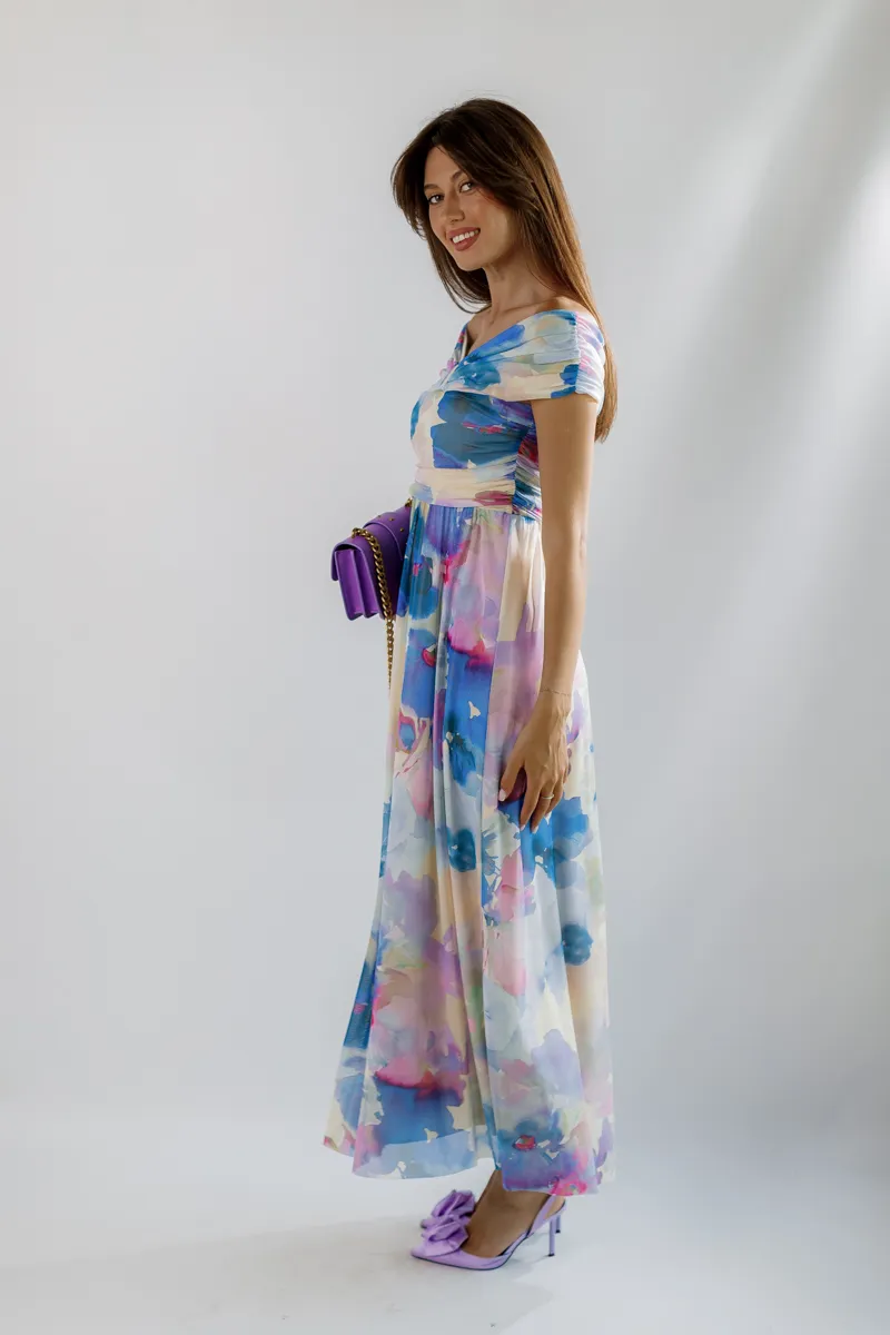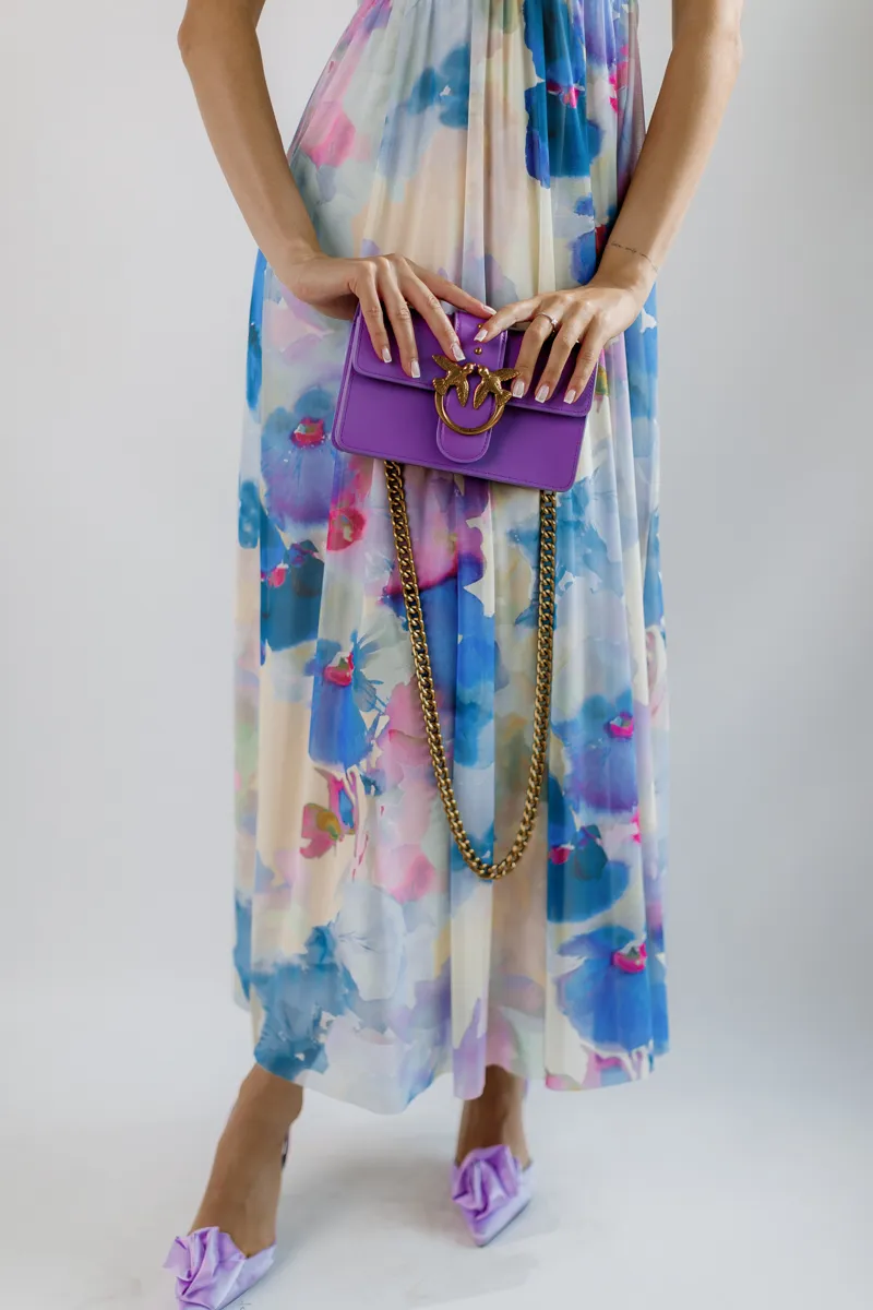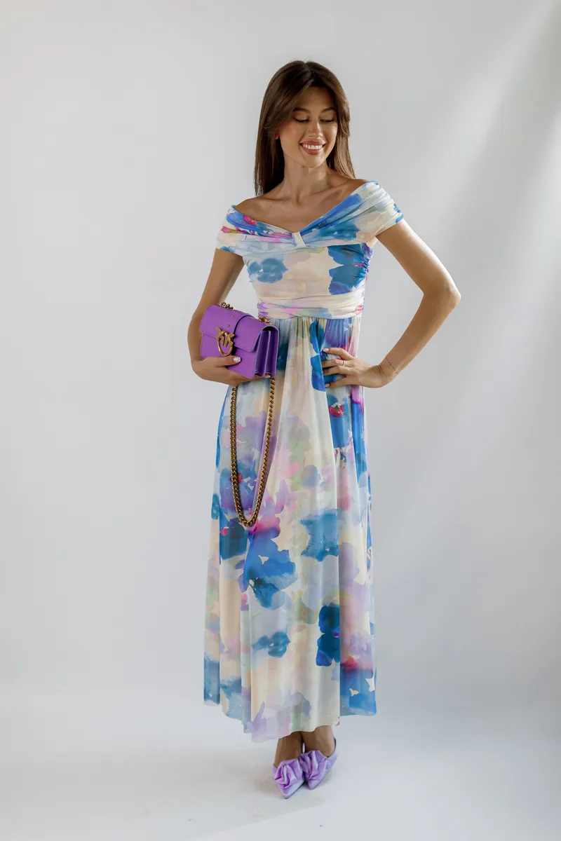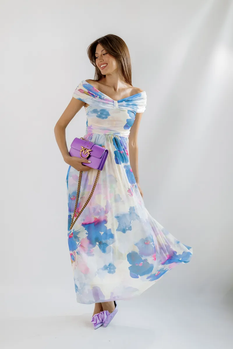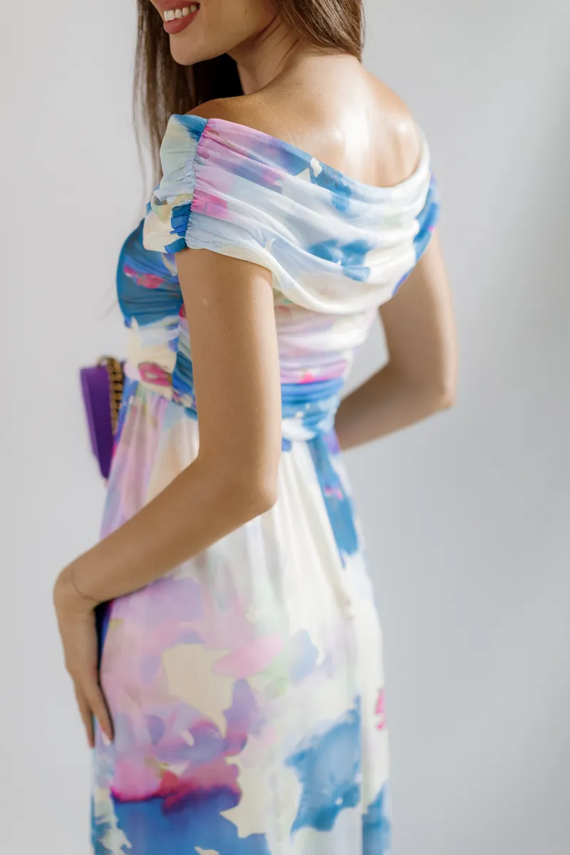 Принт тай дай у відтінках білого, блакитного та фіолетового створює яскравий та модний образ. Особливий акцент зроблений на рукави у вигляді банта, що додає сукні елегантності та унікальності.