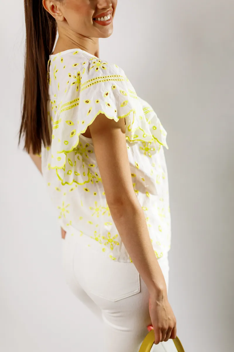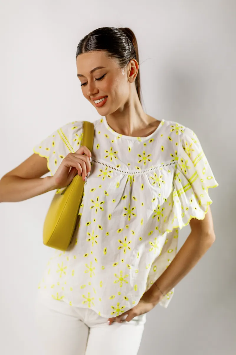 Ця стильна блуза від французького виробника виготовлена з 100% натуральної бавовни, що забезпечує комфорт та природну вентиляцію. Комбінація білого та салатового кольорів додає свіжості та яскравості вашому образу. Короткий рукав і вільний крій роблять цю блузу ідеальним вибором для літнього сезону. Оригінальність виробу підкреслюють витончені елементи прошви.