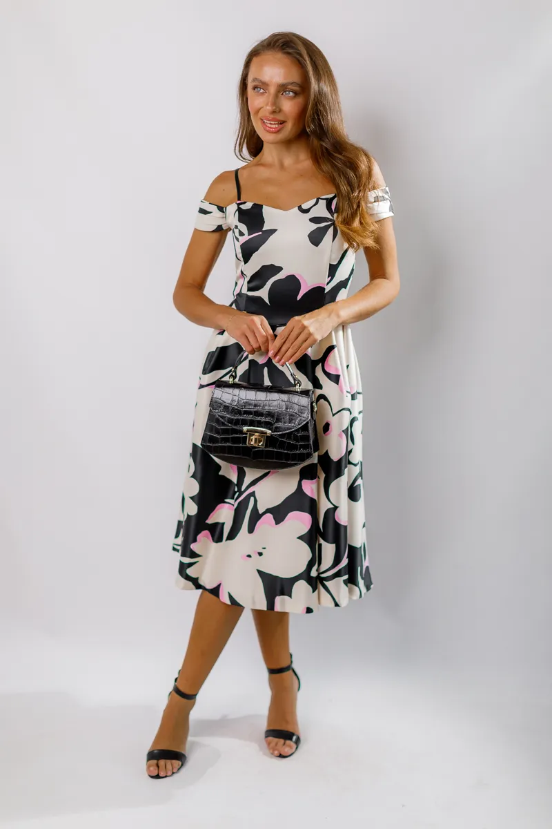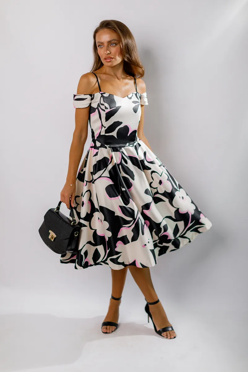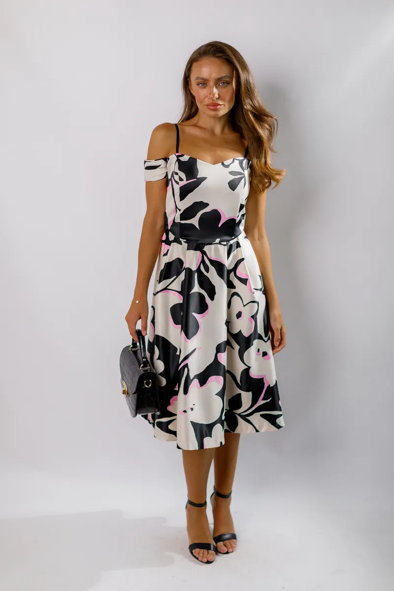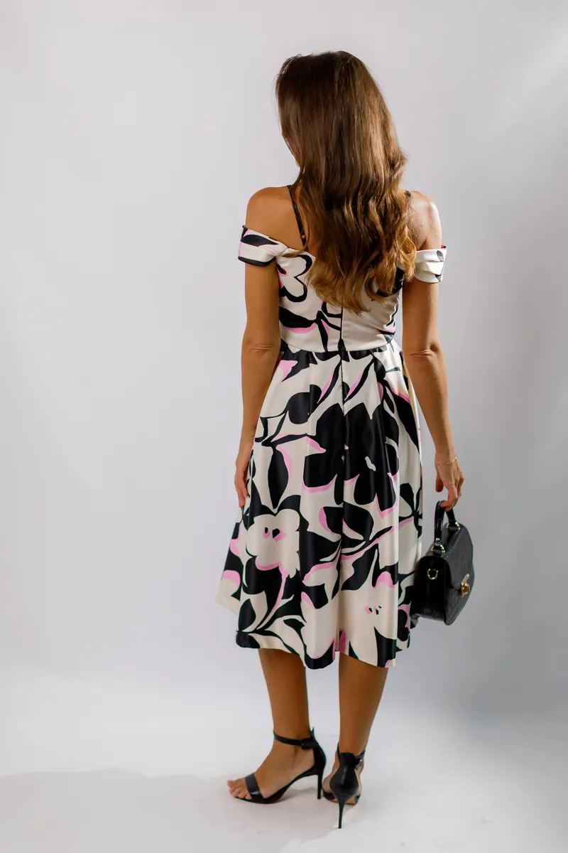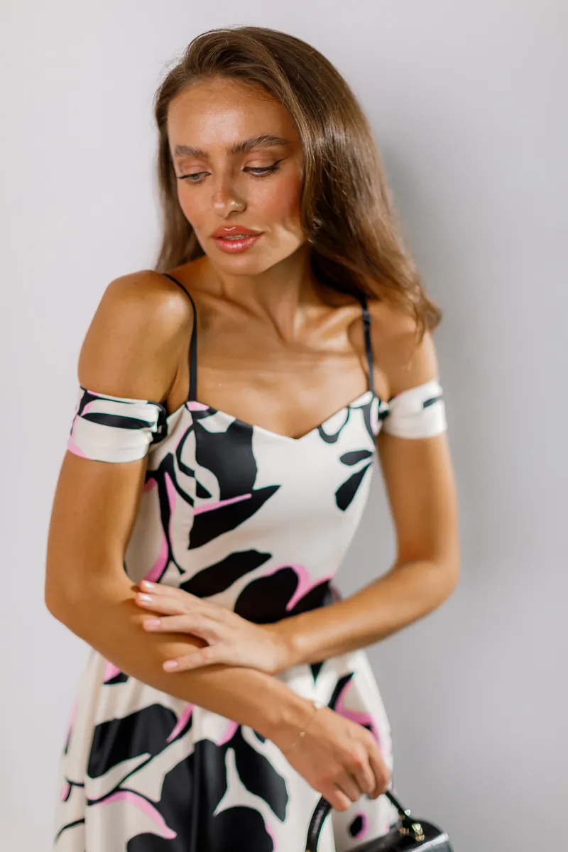 Довжина міді та відкриті плечі додають образу жіночності та витонченості. Чорно-біло-рожевий колірний спектр робить сукню універсальною для різних подій, підкреслюючи вашу індивідуальність та стиль.