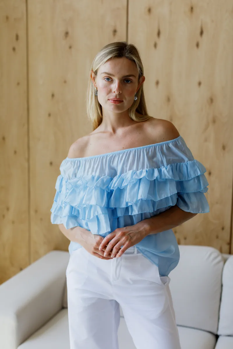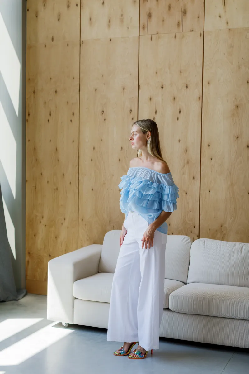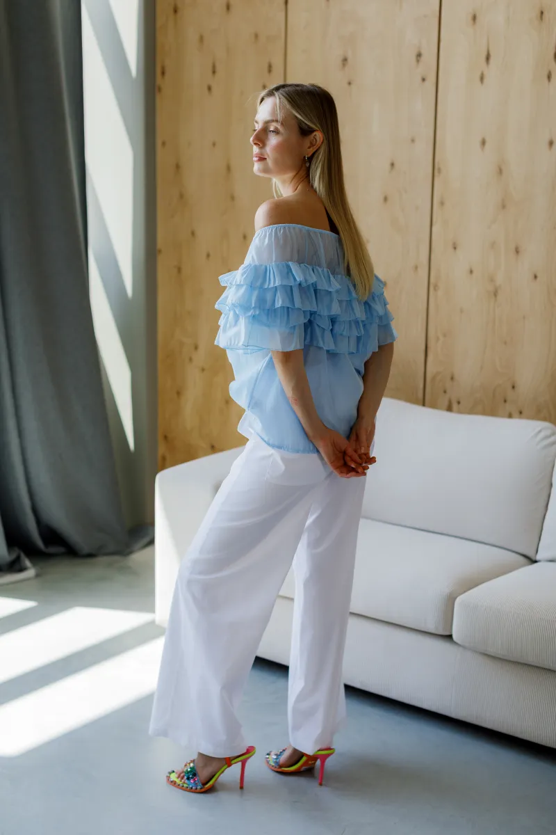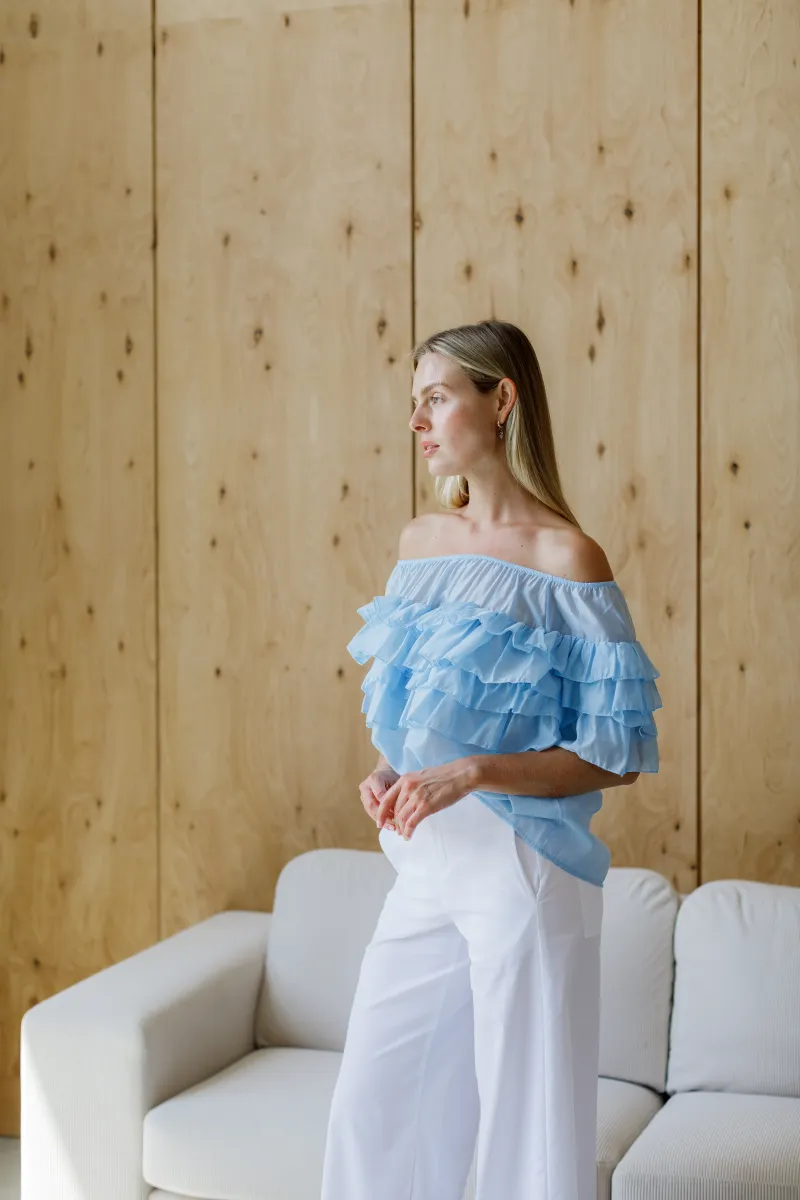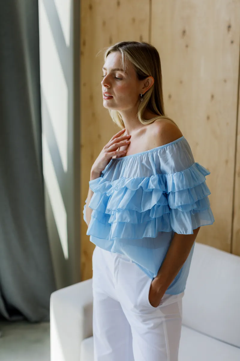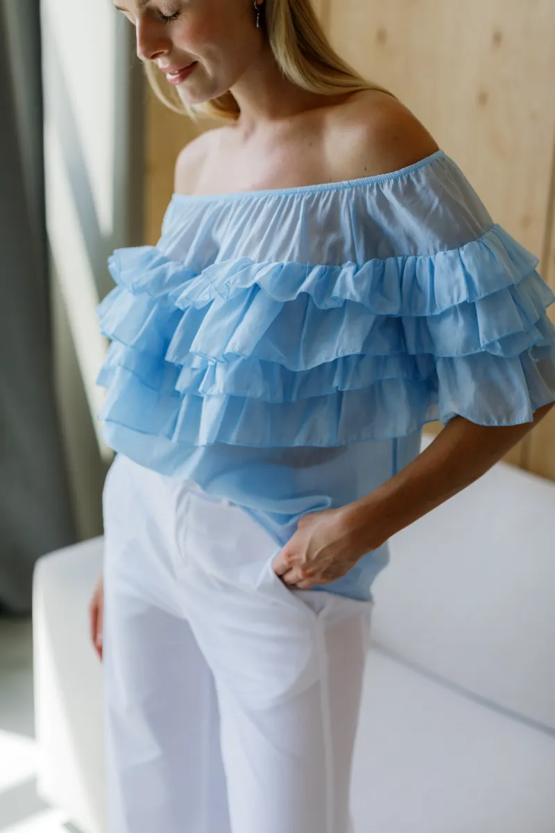 Блакитна блуза з відкритими плечима та багатоярусними воланами