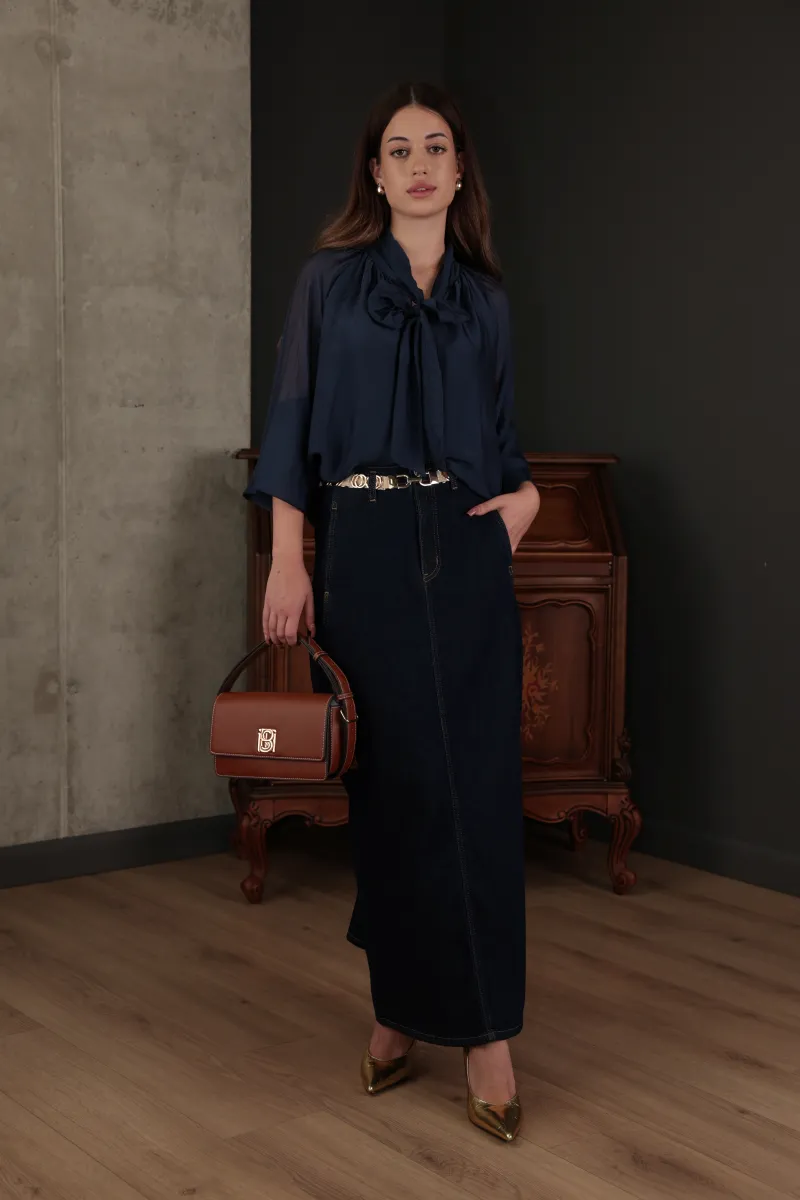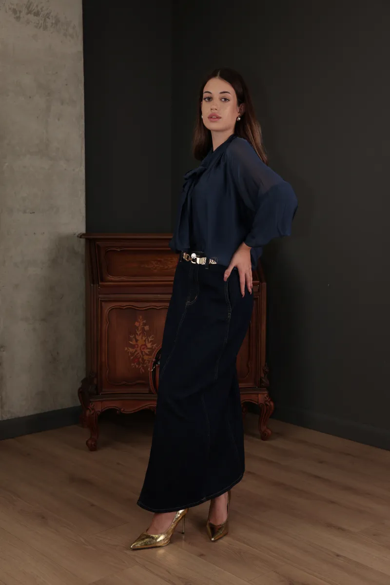 Елегантна темно-синя блуза з легкої тканини з об’ємними рукавами та декоративним бантом.