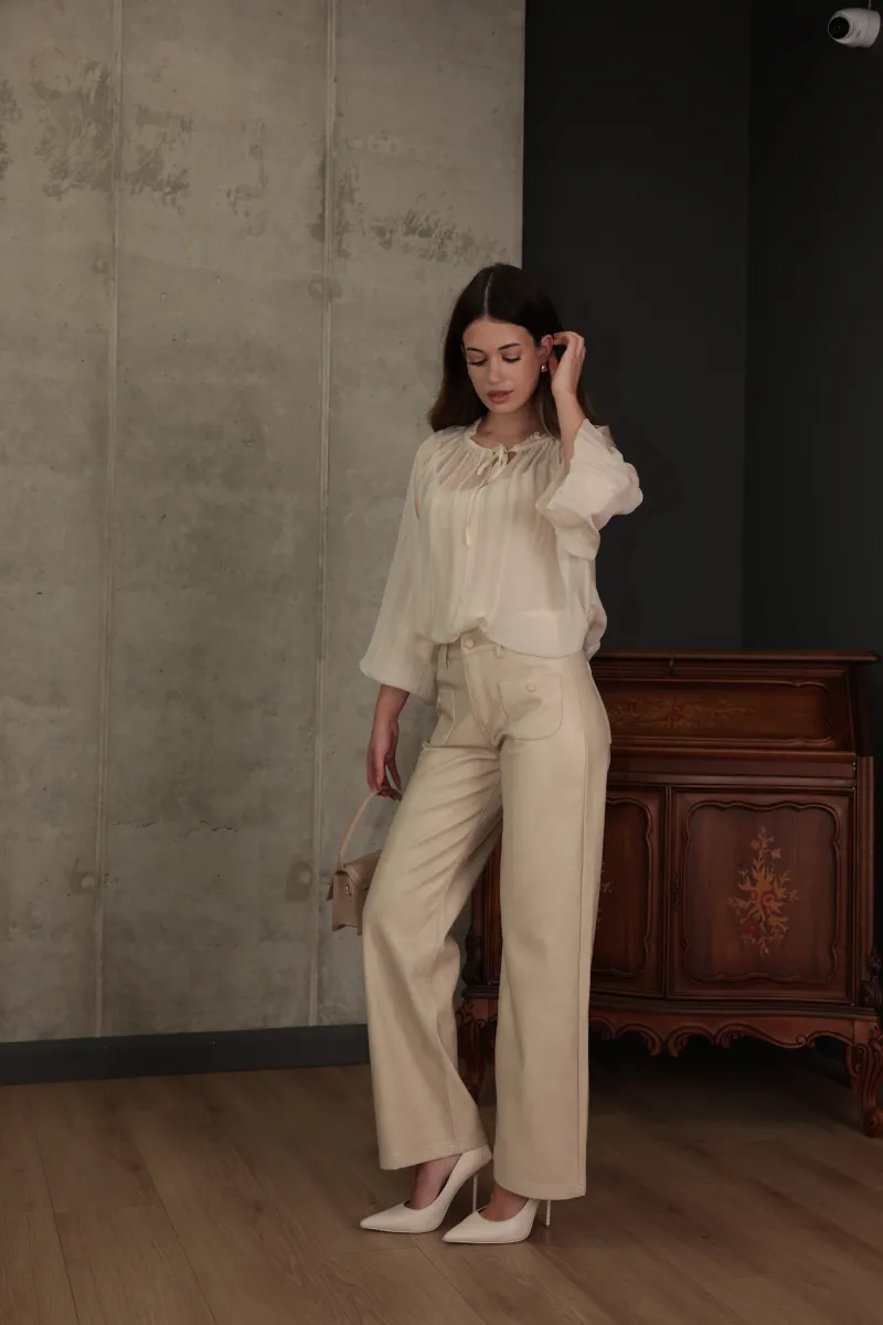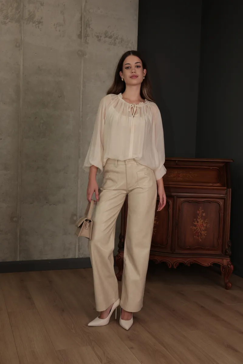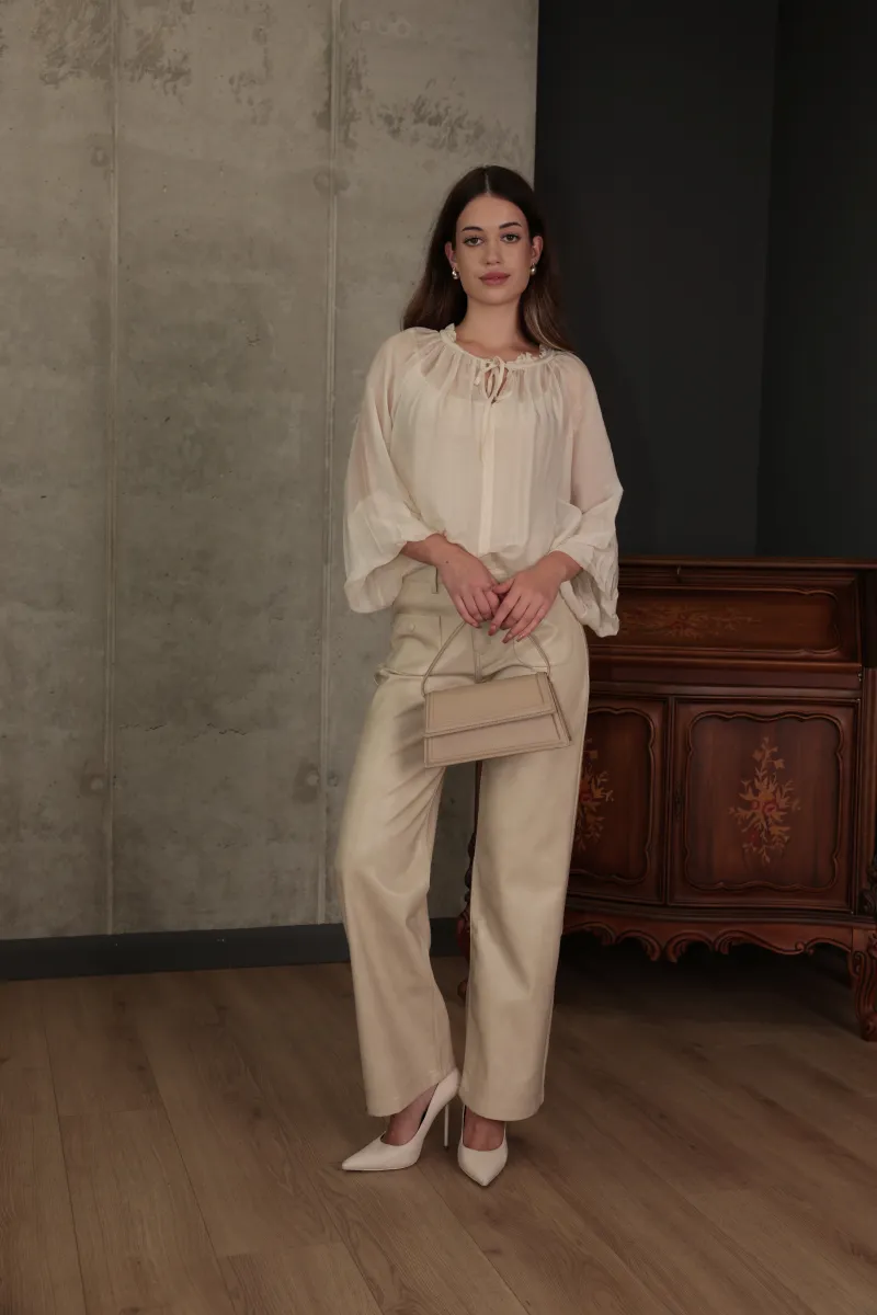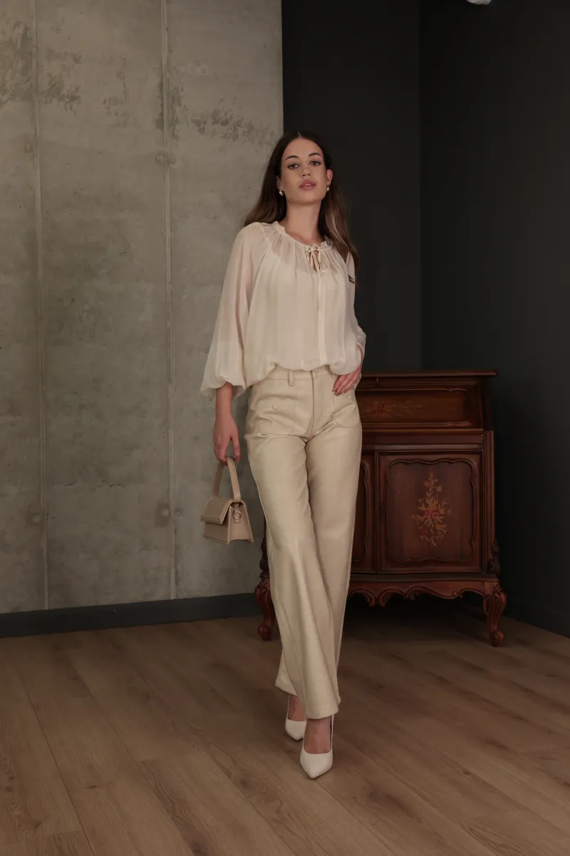 Легка шифонова блуза кольору шампань з пишними рукавами та зав’язкою на горловині.
