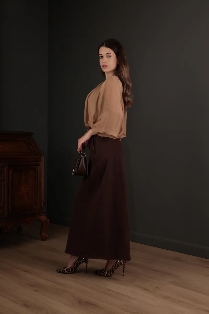Колір: пряна карамель — теплий, глибокий, нейтральний тон, що пасує до базових та акцентних кольорів гардеробу.