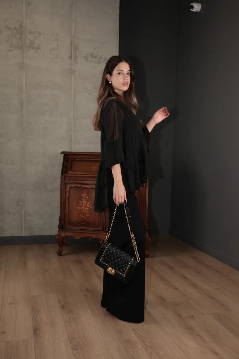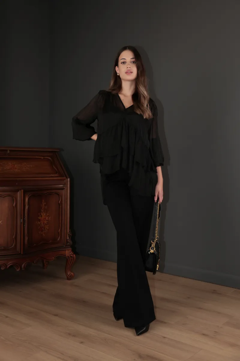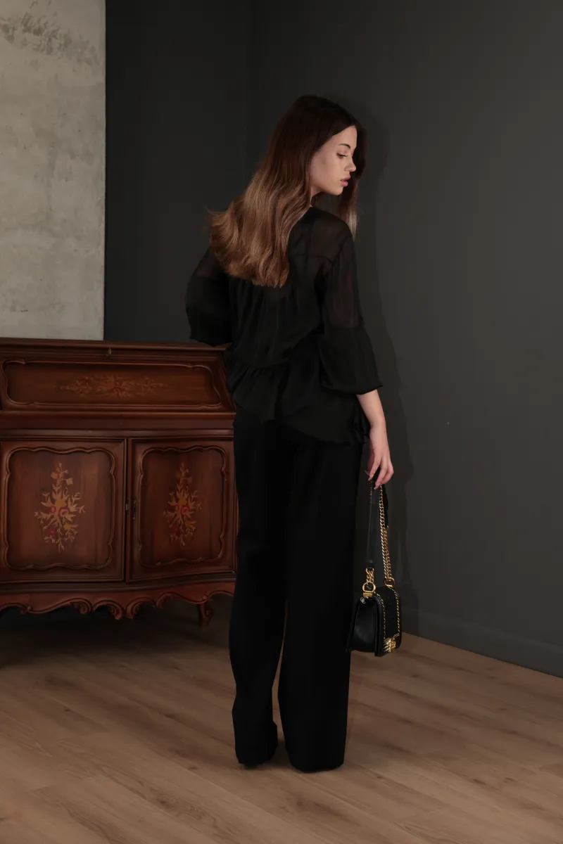 Легка шифонова блуза з романтичним бантом на горловині, що підкреслює елегантність образу