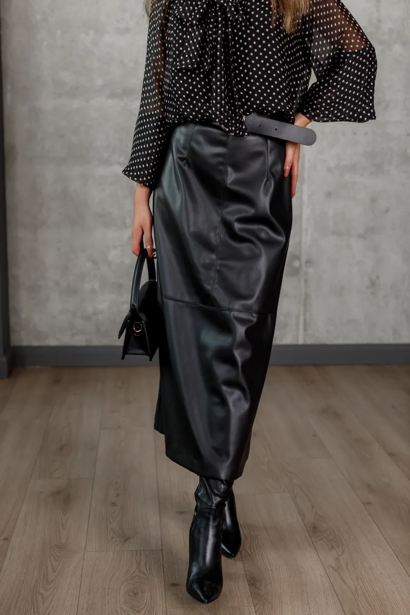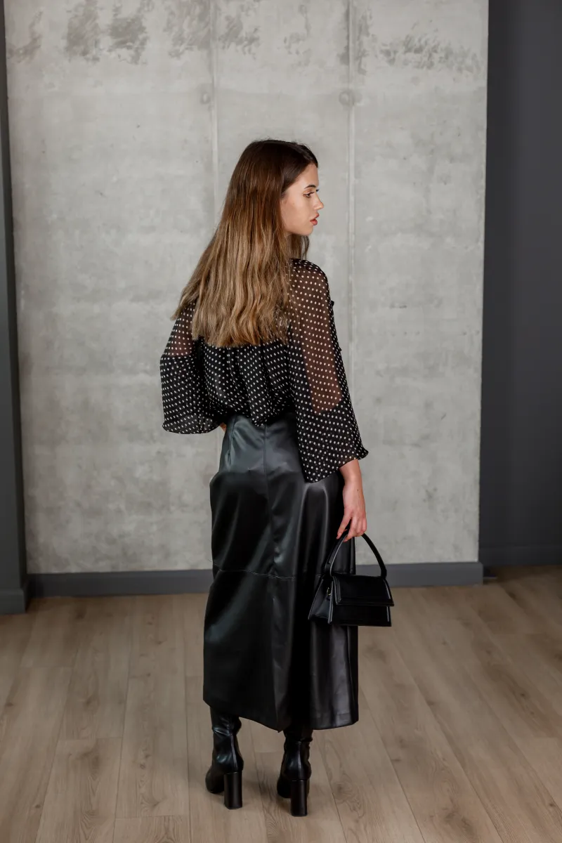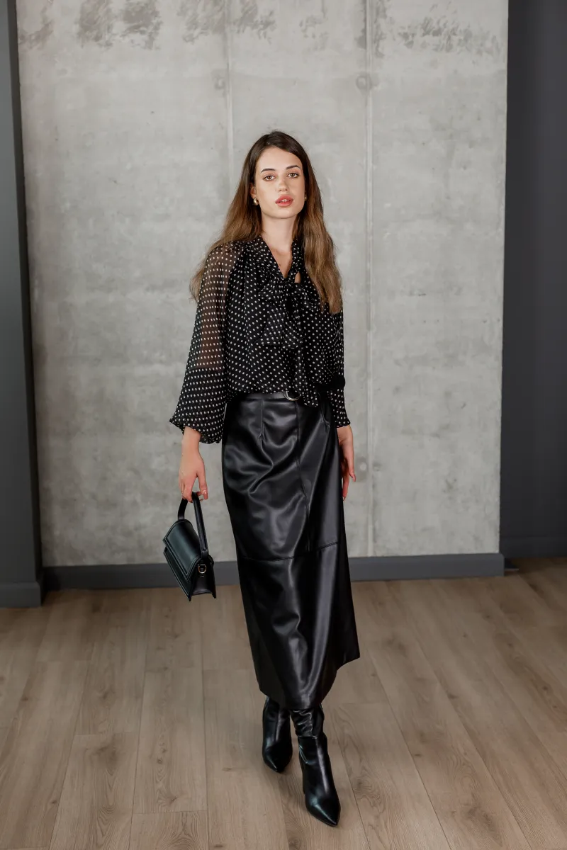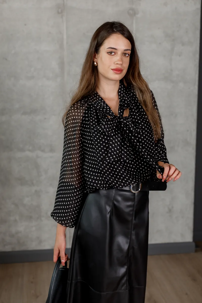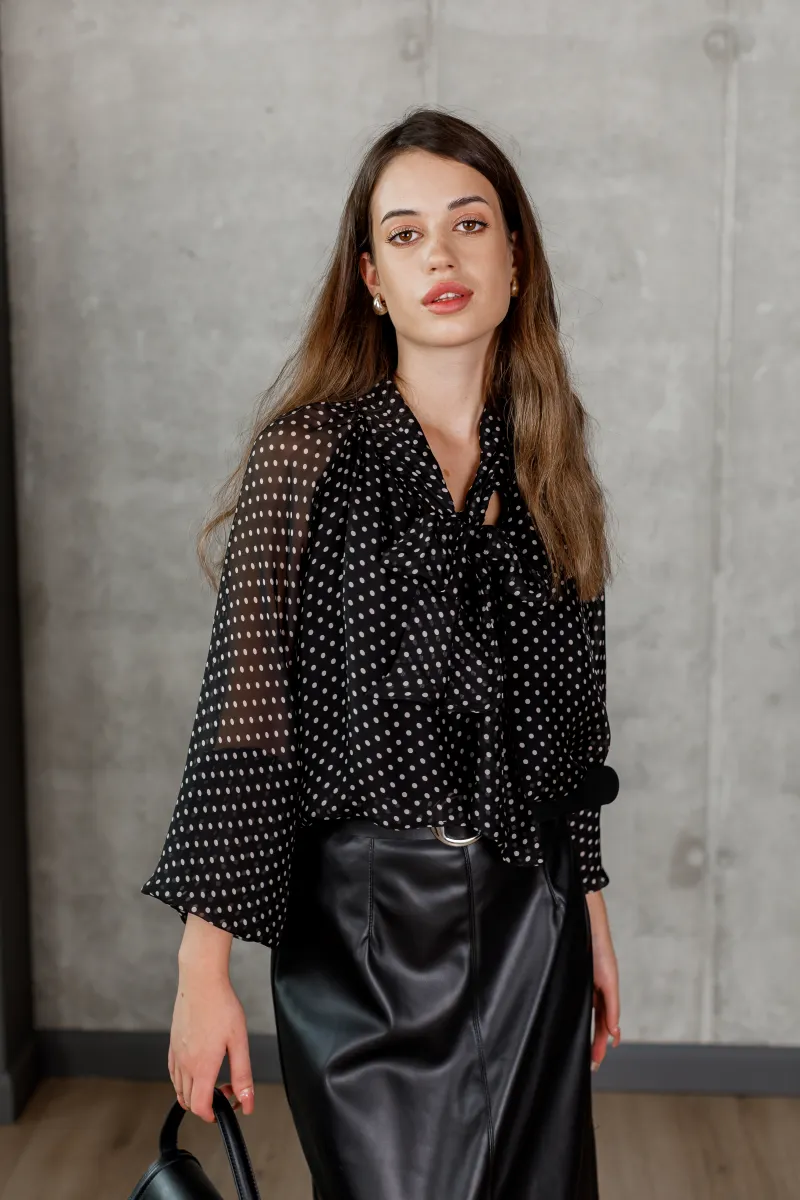 Шифонова блуза чорного кольору в білий дрібний горох із бантом на комірі