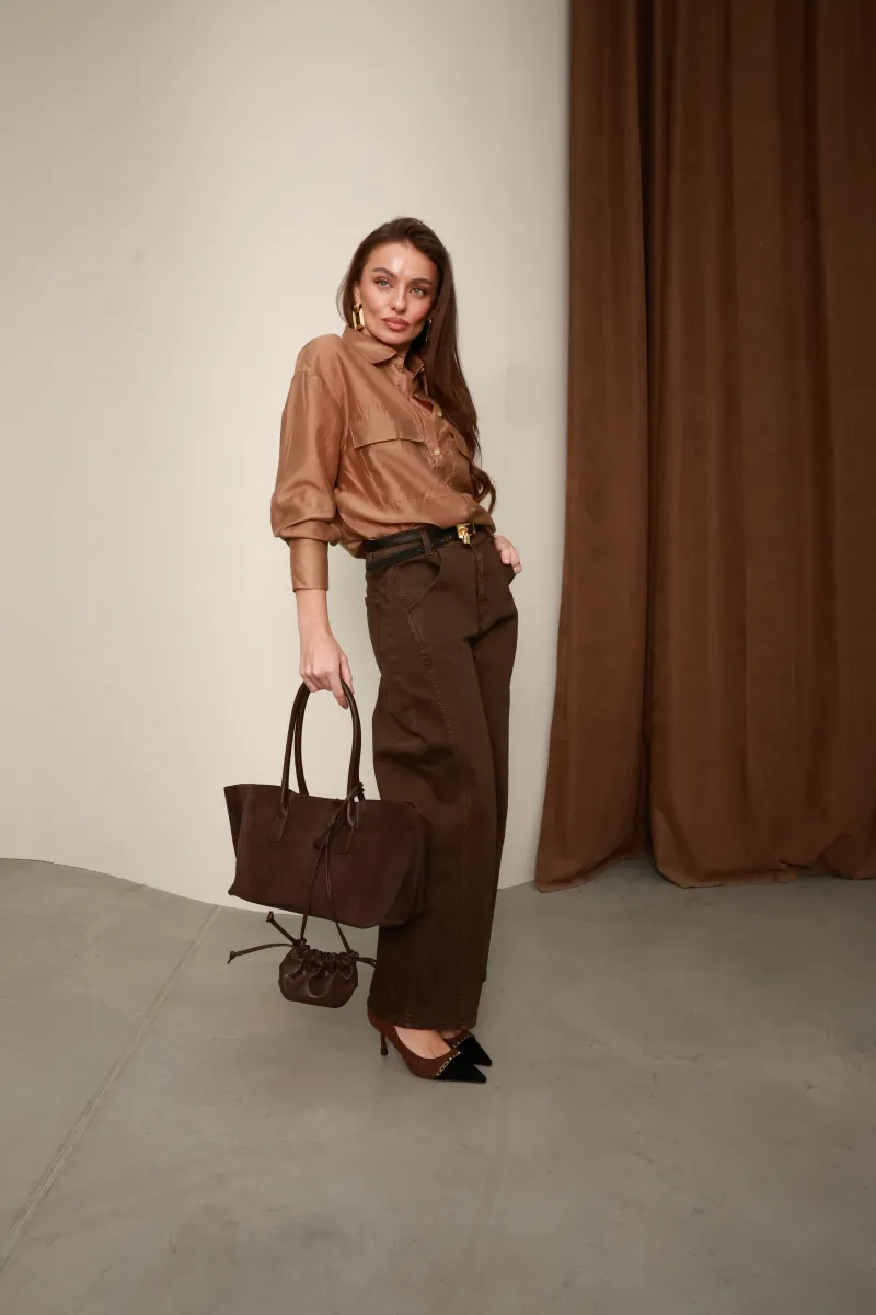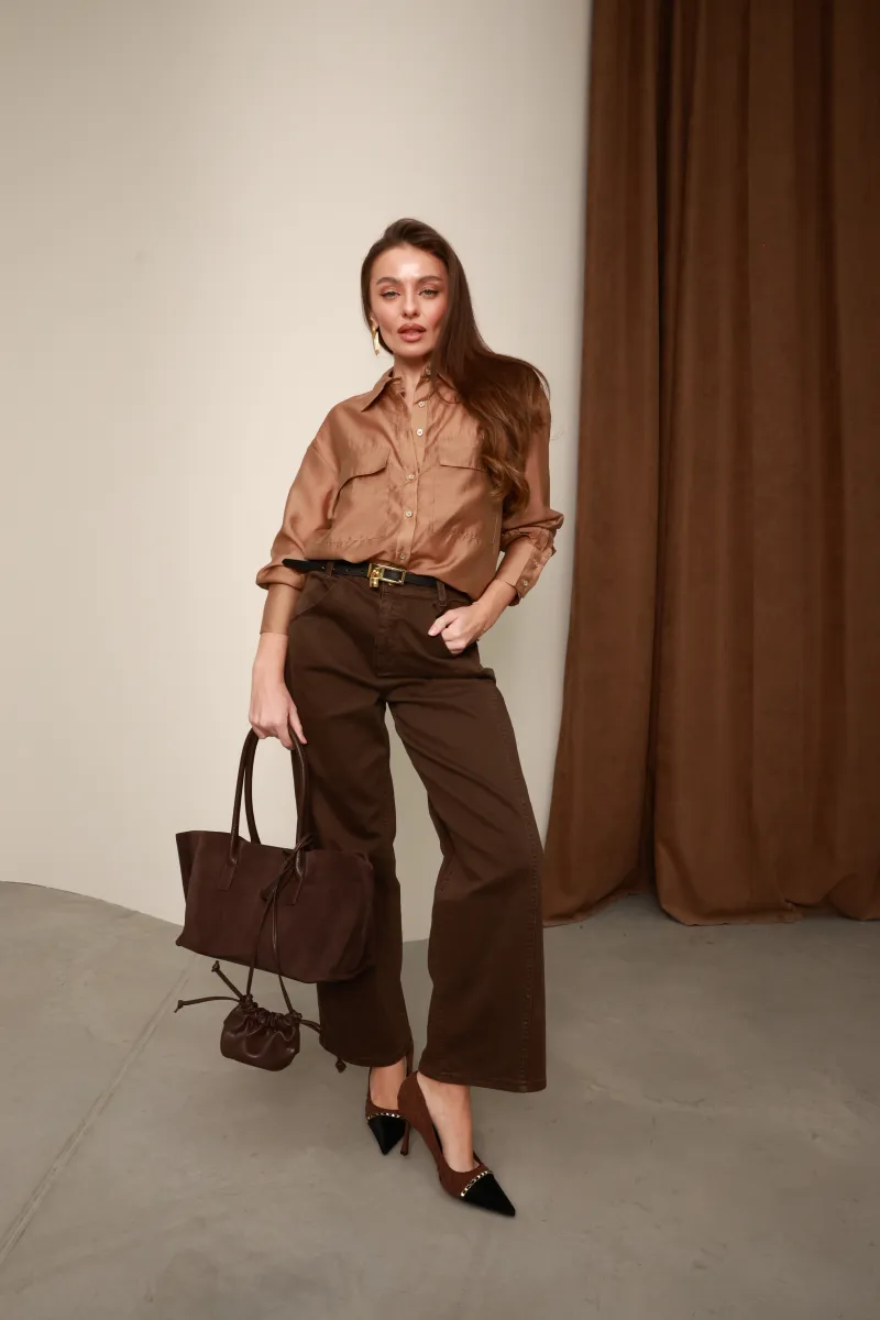 Глибокий шоколадно-карамельний відтінок ідеально поєднується з брюками, екошкірою або денімом, роблячи модель універсальною для стилів casual chic, modern classic та quiet luxury.
