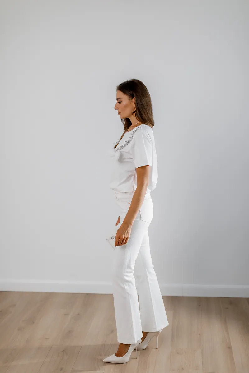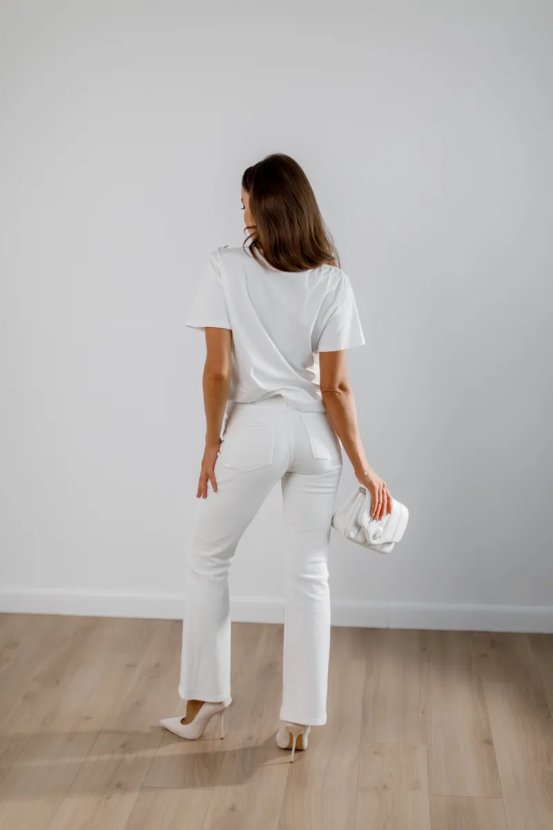Елегантні класичні джинси-кльош від провідних французьких виробників, які поєднують в собі ретро-стиль і сучасний комфорт. Висока посадка забезпечує ідеальну посадку, підкреслюючи вашу талію, а кльош-крій додає образу нотки ретро-шарму. Світлий білий колір робить ці джинси універсальними, підходячи як для повсякденних образів, так і для більш офіційних виходів.