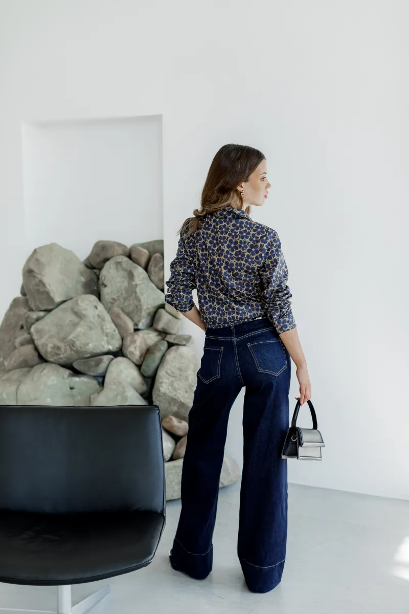 Темно-сині джинси вільного крою з контрастною прострочкою та високою посадкою.