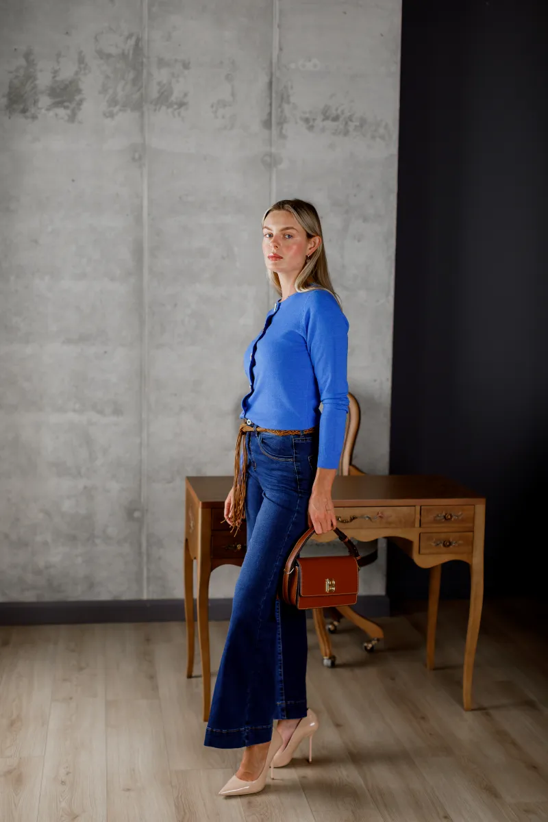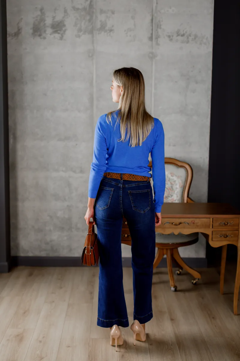 Темно-сині джинси з високою посадкою та розкльошеним низом, які візуально подовжують ноги та підкреслюють фігуру
