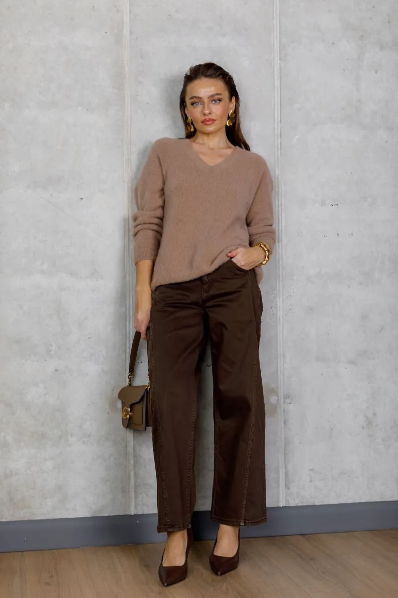 Модель має високу посадку, що красиво підкреслює талію та створює комфортну посадку. Джинси виконані з приємного до тіла, щільного бавовняного деніму зі стрейчем, що забезпечує ідеальну посадку по фігурі без дискомфорту. Пара чудово поєднується як із підборами, так і з кедами, а глибокий коричневий колір легко комбінується з базовими та теплими відтінками гардероба.