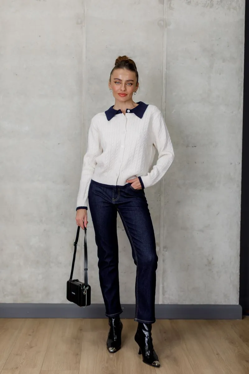 Базові прямі джинси з деніму глибокого синього кольору з контрастною строчкою.