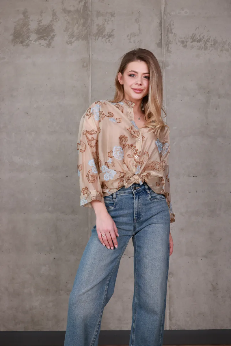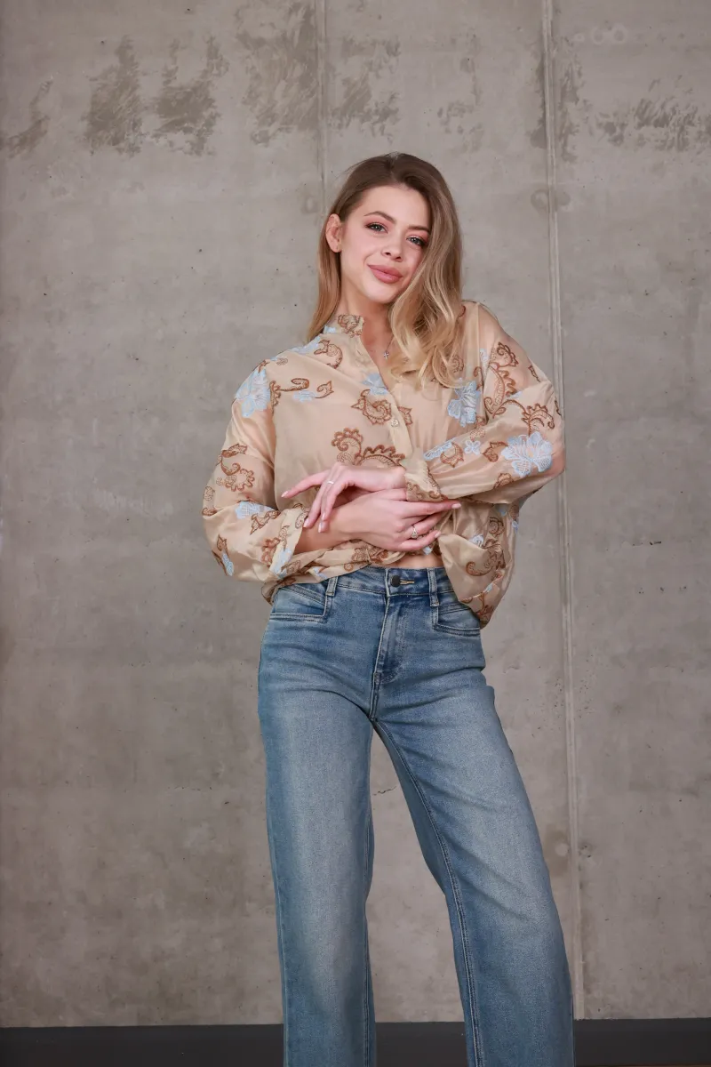 Висока посадка акцентує талію та формує жіночний силует, а прямі широкі штанини додають образу легкості й комфорту.