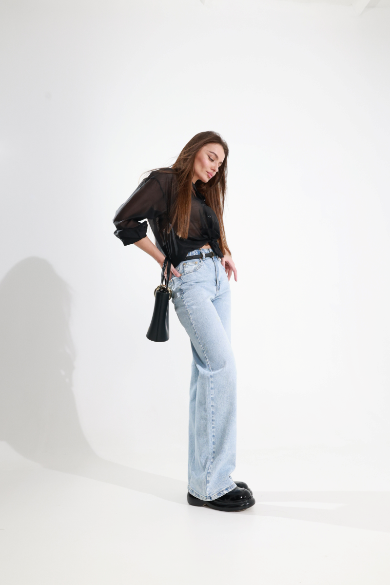Світло-блакитні джинси з високою посадкою — універсальна модель для сучасного гардероба.