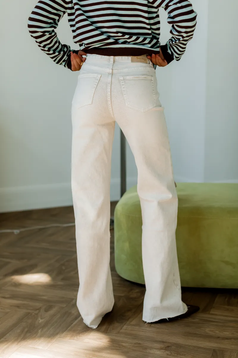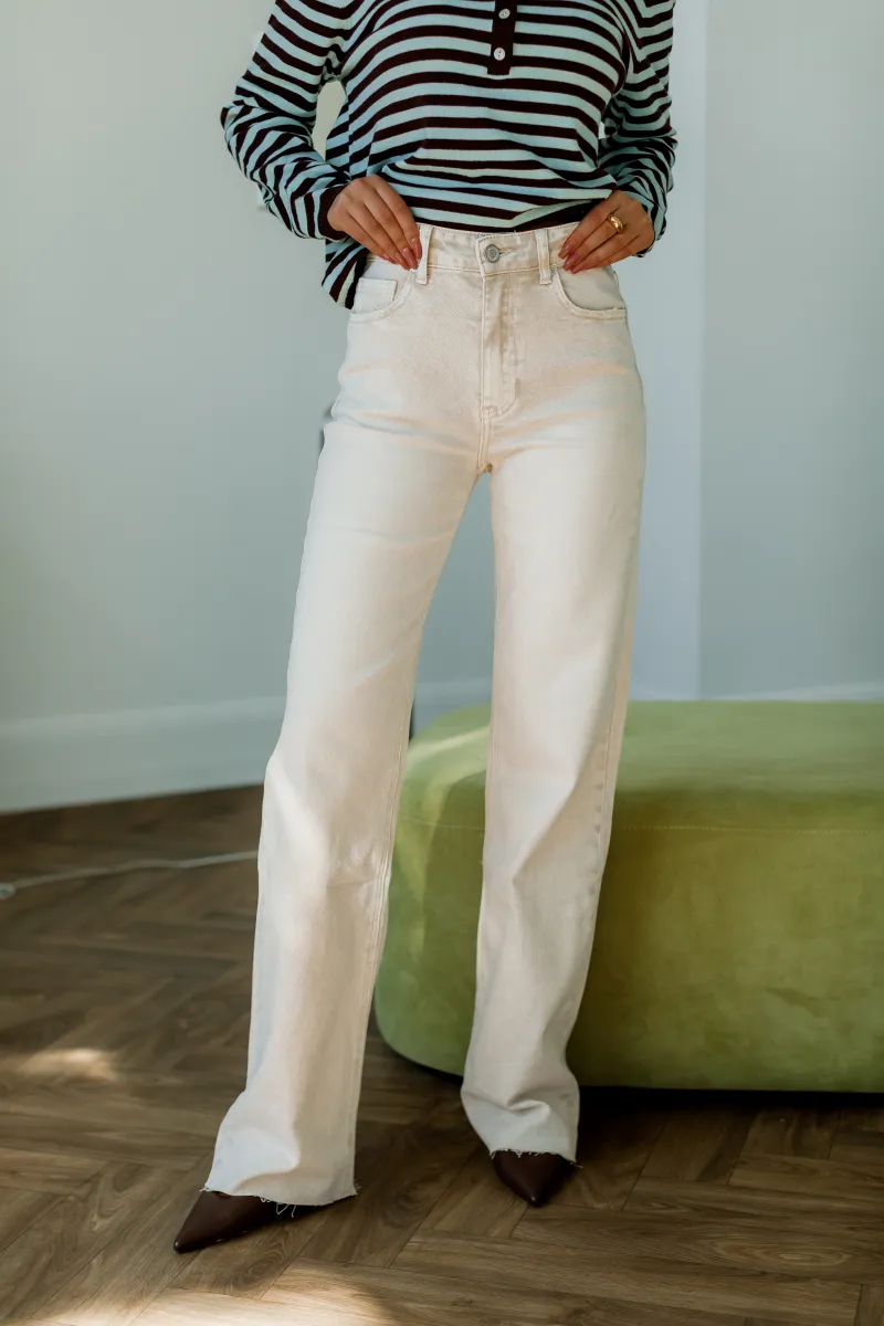 Молочно-бежеві джинси зі щільного деніму з високою посадкою — універсальна базова модель прямого крою