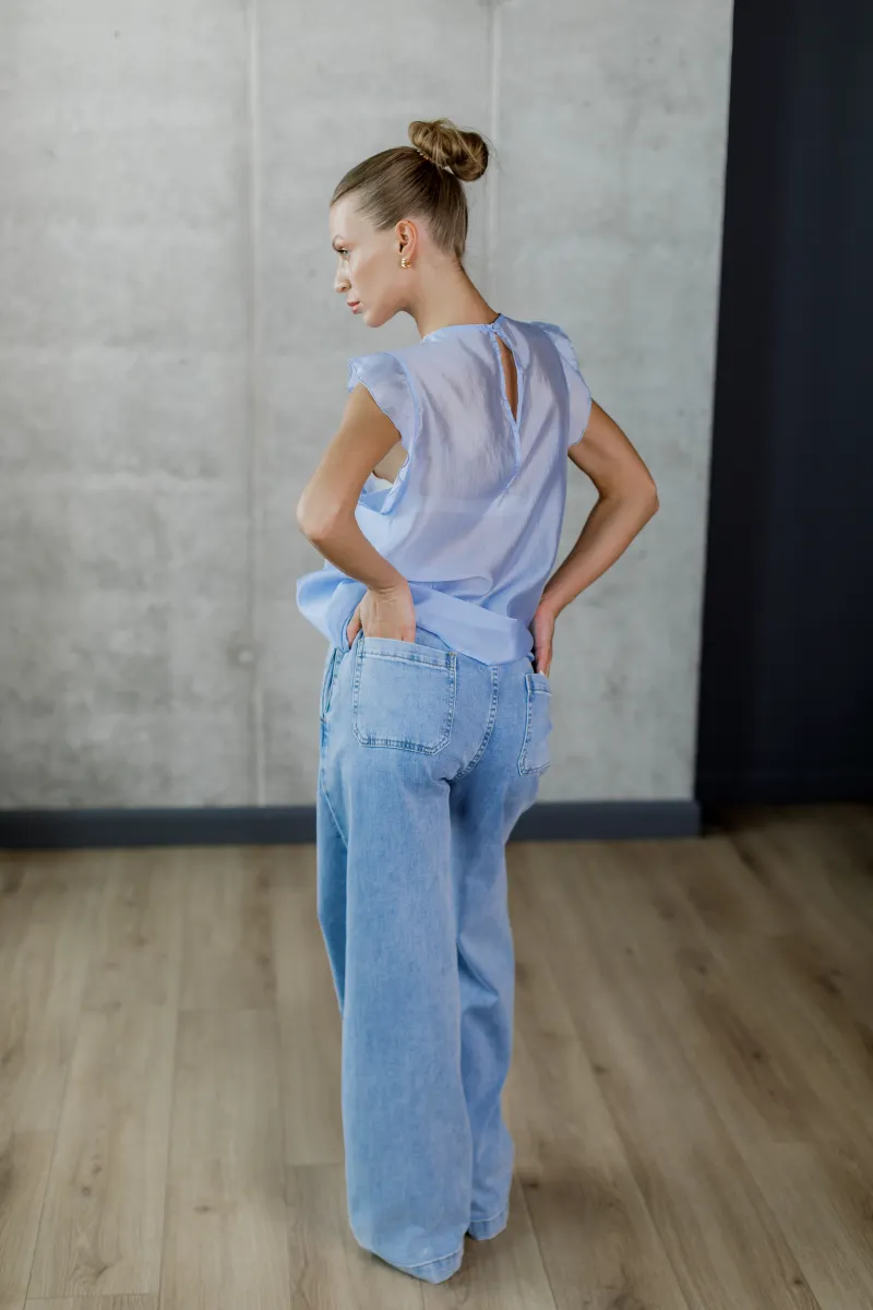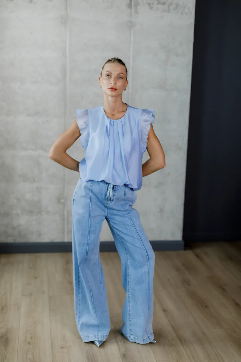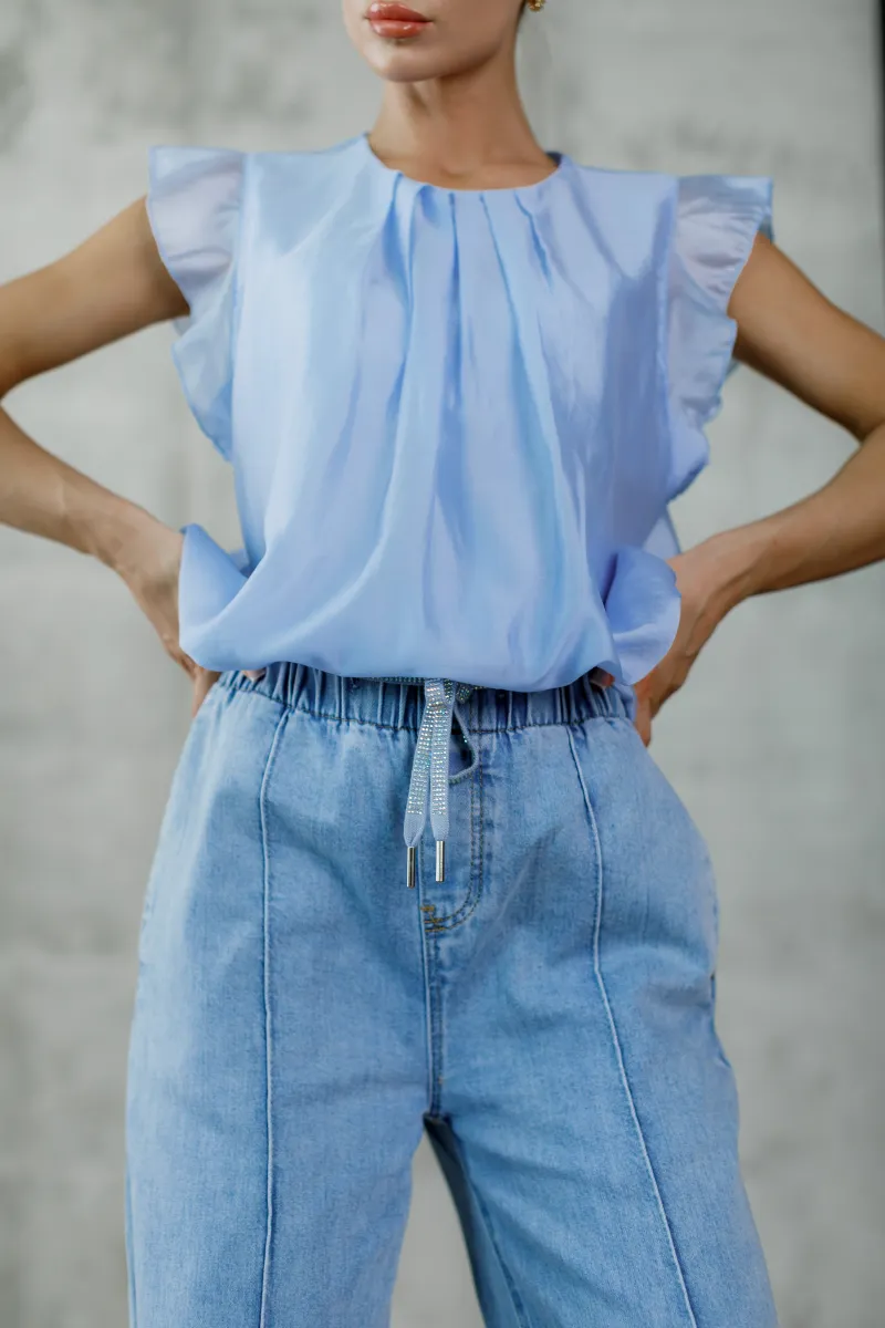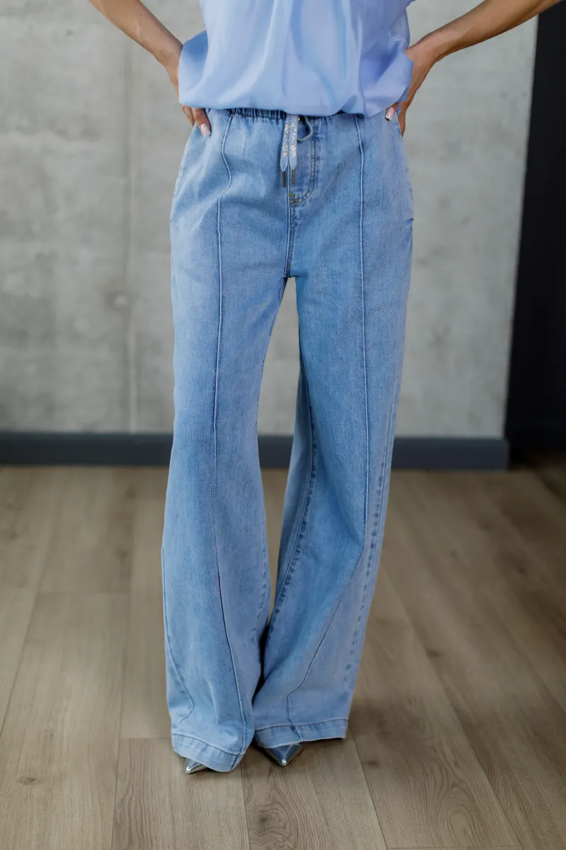 Ці світло-блакитні джинси з еластичним поясом і декоративною зав'язкою зі стразами поєднують комфорт і стиль. Прямий крій та шви вздовж штанин візуально подовжують силует, а легкий денім дарує відчуття свободи протягом усього дня. Ідеальний варіант для повсякденних образів, який легко комбінується з базовими або яскравими топами.