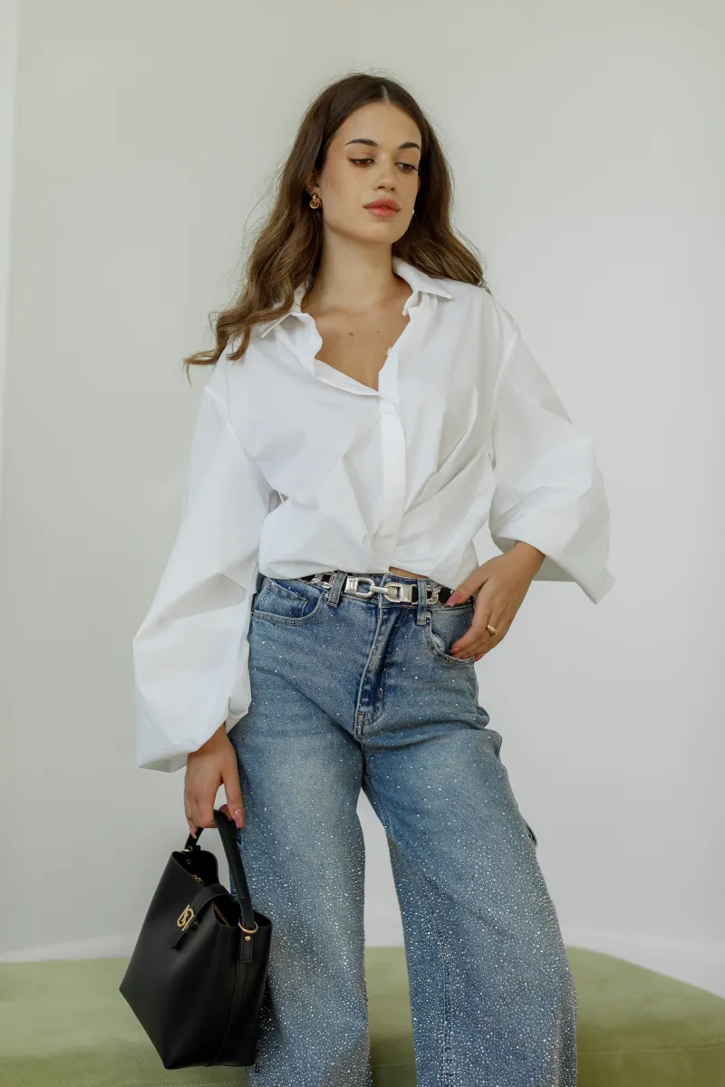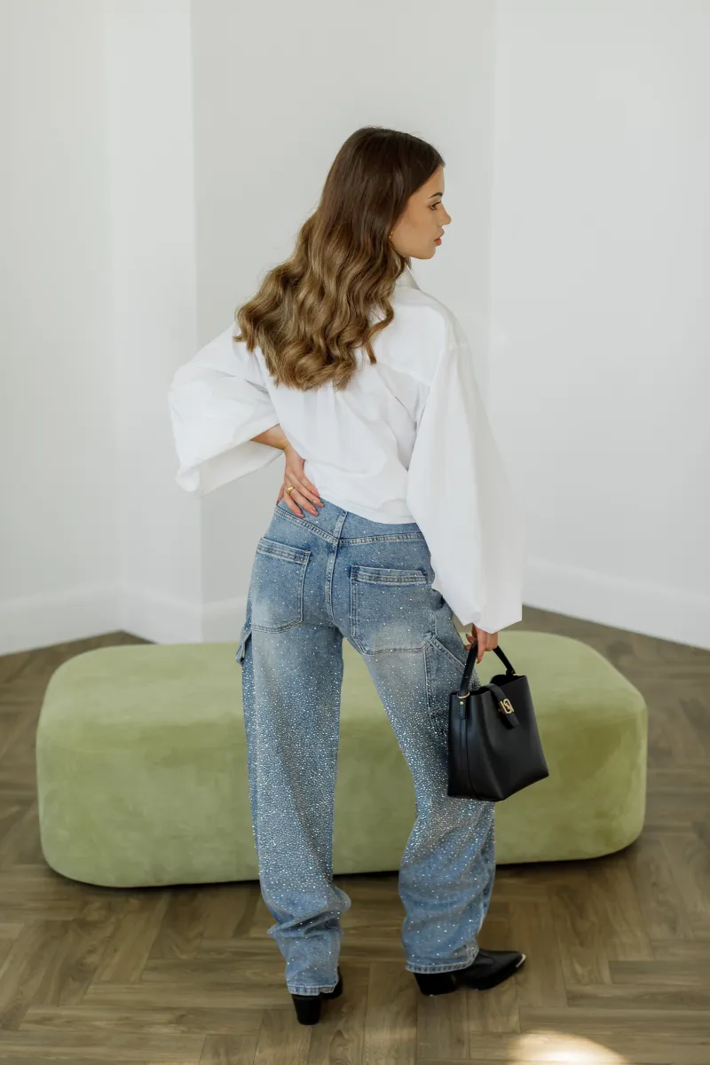 Ефектні джинси вільного фасону, прикрашені блискучими мікростразами по всій поверхні, доповнені накладними кишенями та боковими елементами.