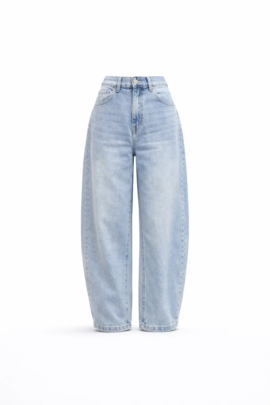 Трендові джинси вільного крою у світло-блакитному відтінку, що створюють розслаблений і сучасний силует.