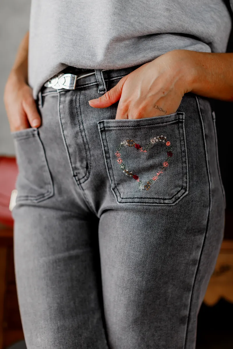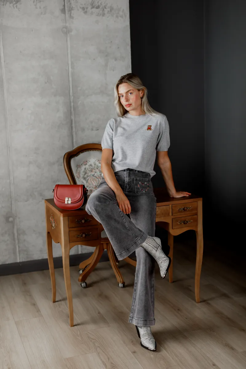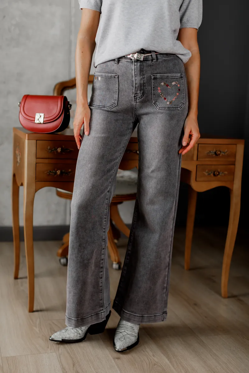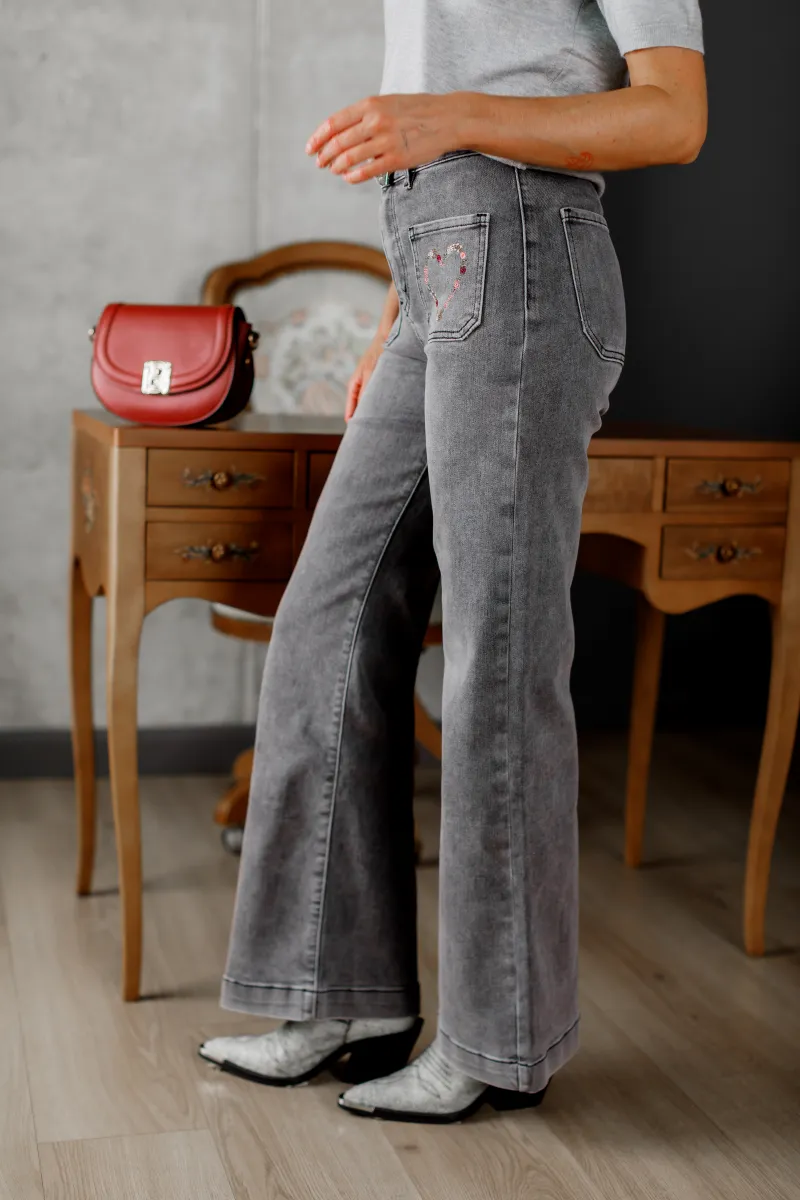 Сірі джинси кльош із м’якого деніму з вишивкою у вигляді сердечка на кишені — ідеальне поєднання зручності та акцентного дизайну.