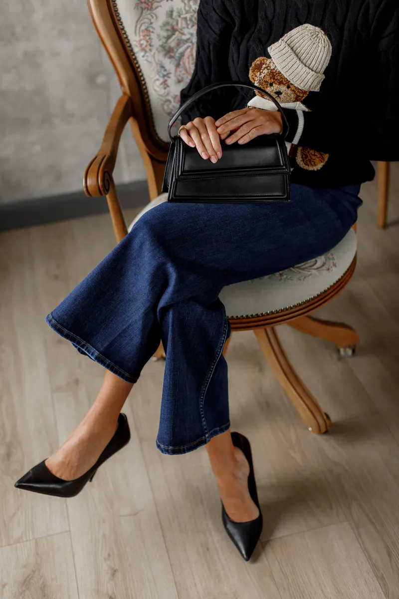 Темно-сині джинси із щільного деніму з високою посадкою та легким розширенням донизу, що створює елегантний силует і візуально подовжує ноги.