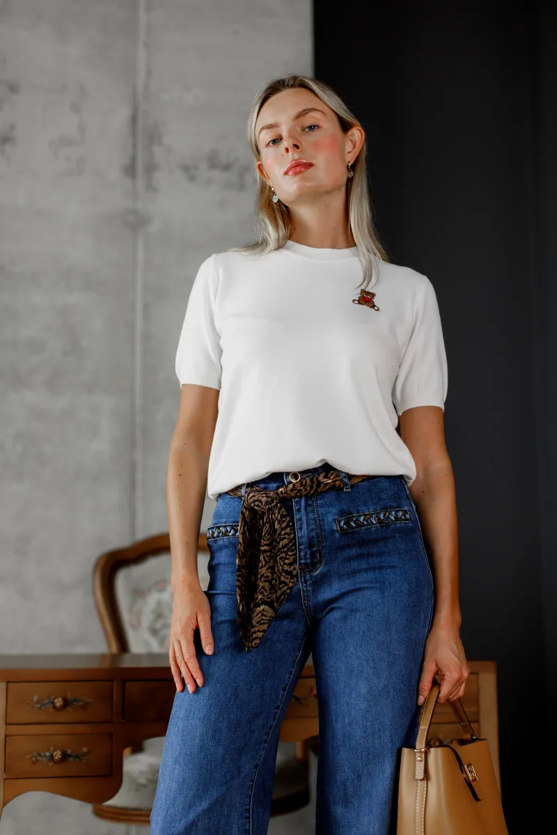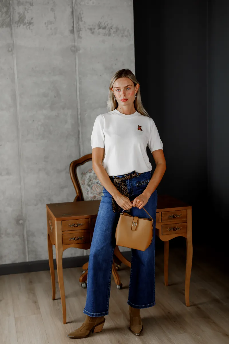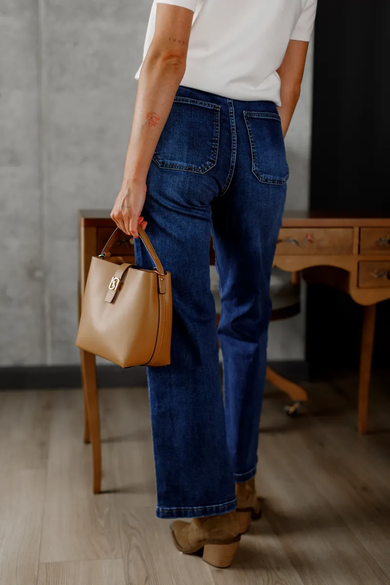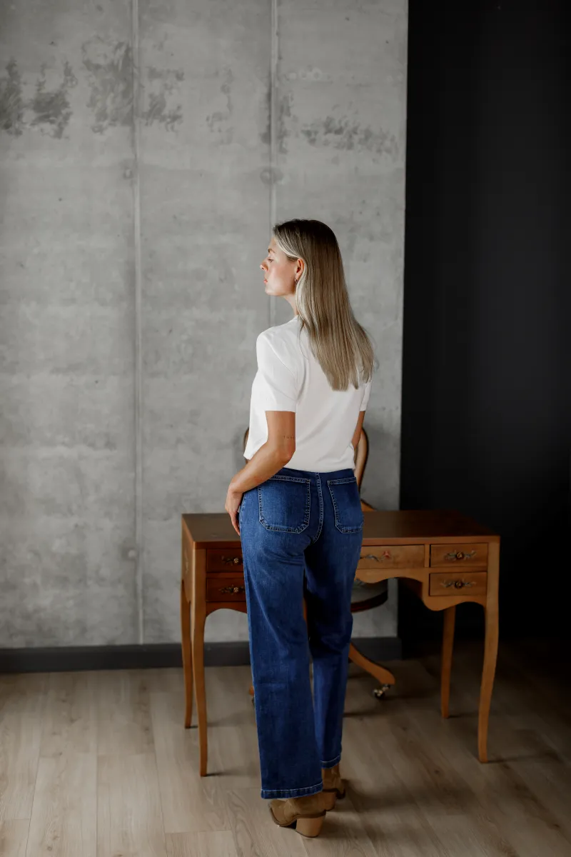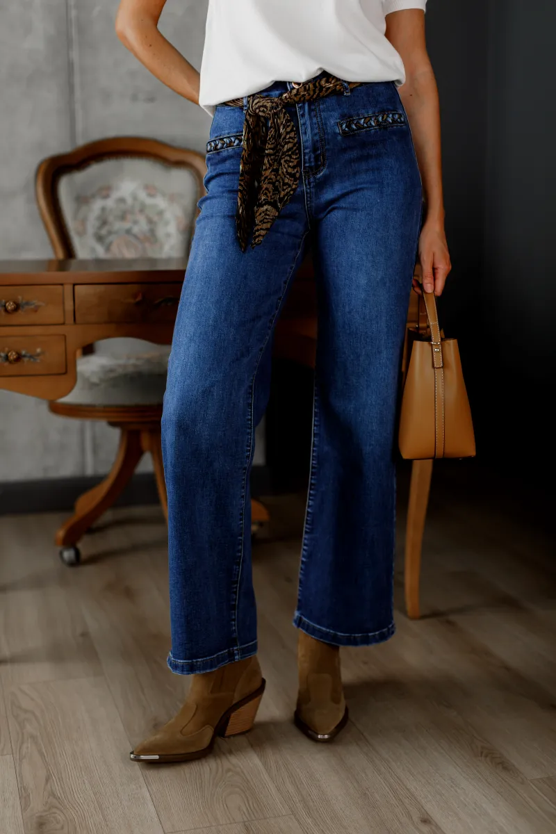 Жіночі джинси прямого крою з щільного еластичного деніму з декоративною тасьмою на передніх кишенях, які додають виробу оригінальності та акценту. Посадка середня, застібка на блискавку і ґудзик. Універсальна модель для повсякденних образів, яка поєднує комфорт і стиль.