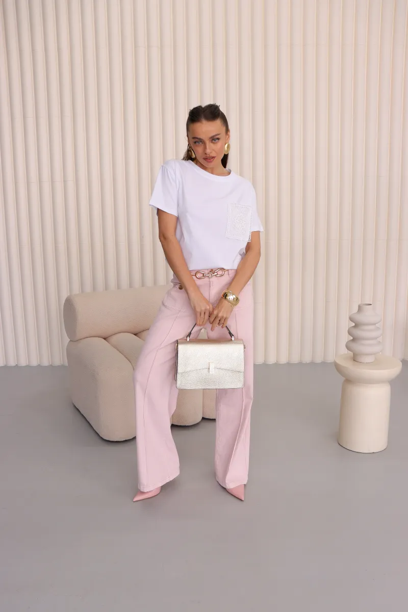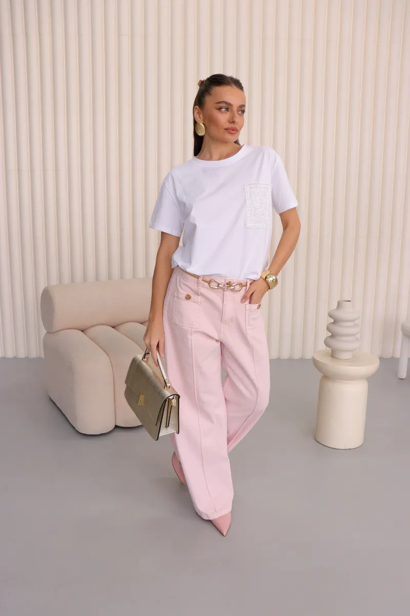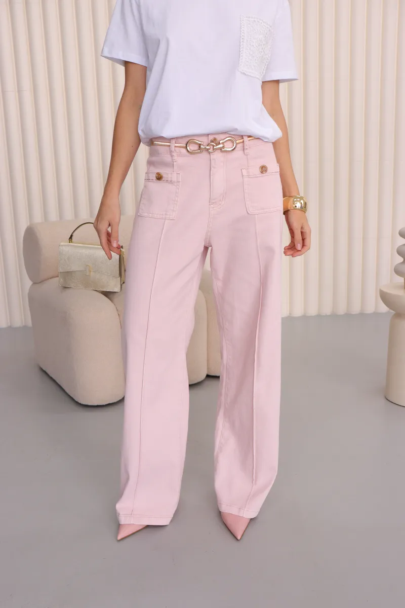 Стильні джинси прямого крою у ніжному рожевому відтінку, що додають образу легкості та свіжості.