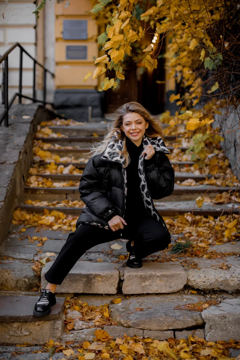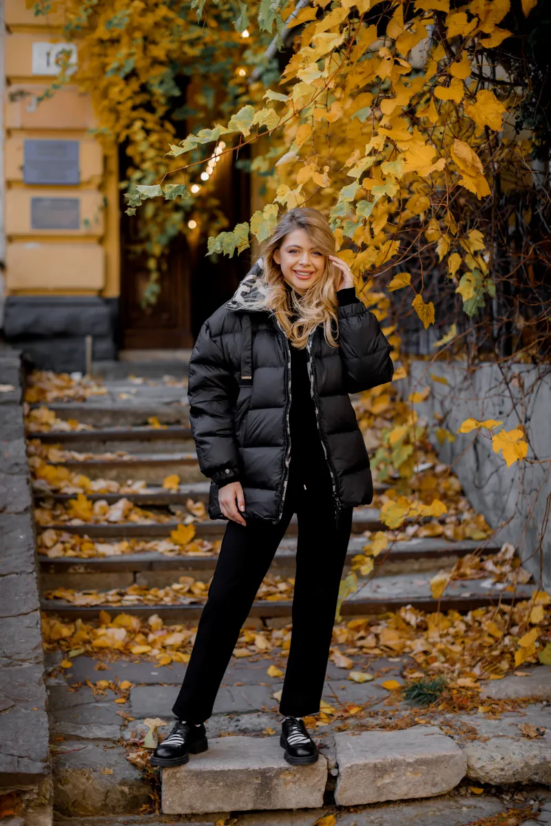 Демісезонна стьобана куртка з об'ємним капюшоном, наповненням з пуху та пера, представлена в чорному, шоколадному і бежевому кольорах.