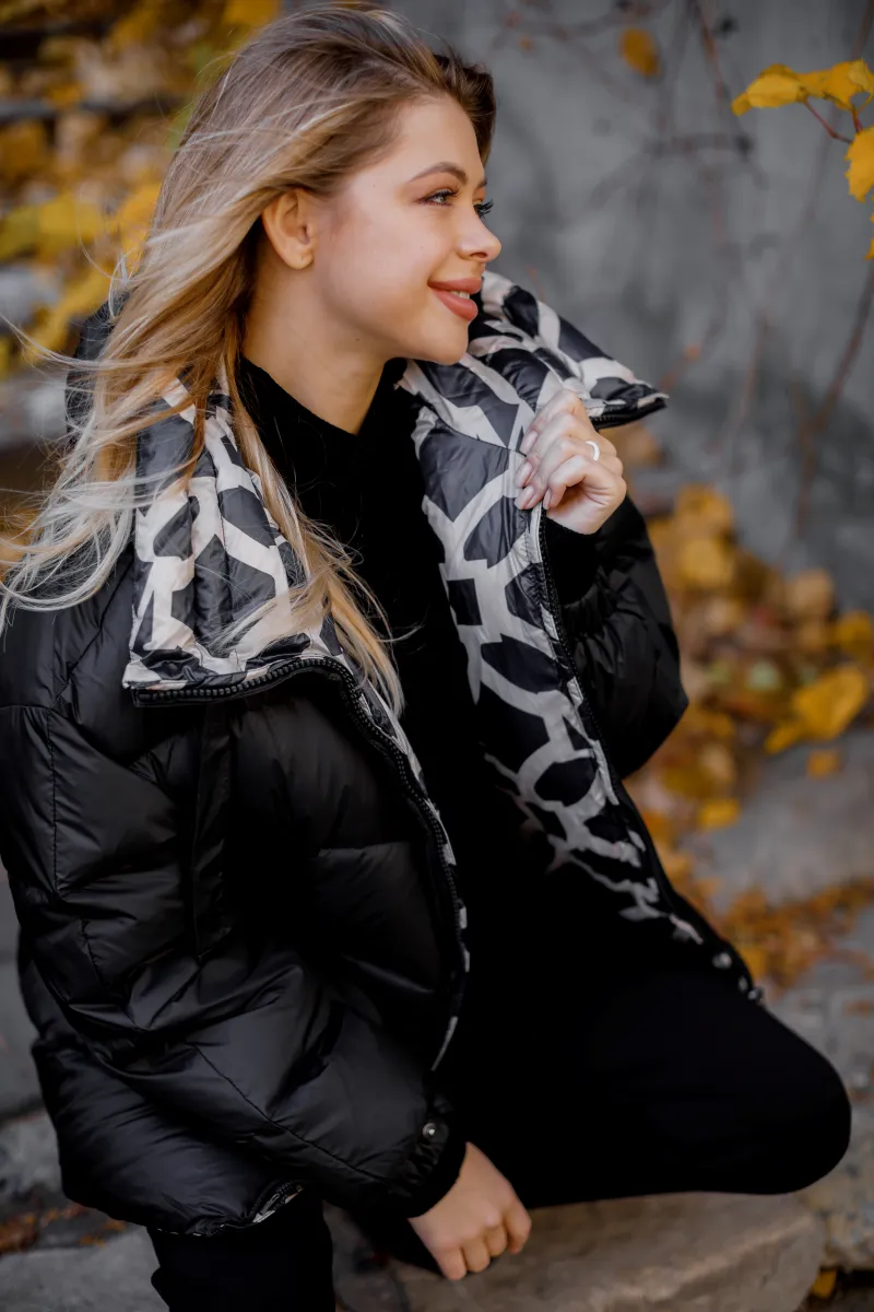 Модель: Стьобана укорочена куртка з об'ємним капюшоном та внутрішнім візерунком