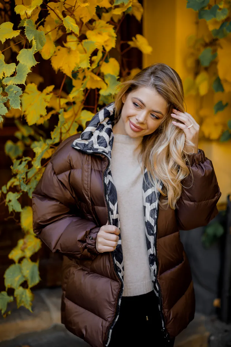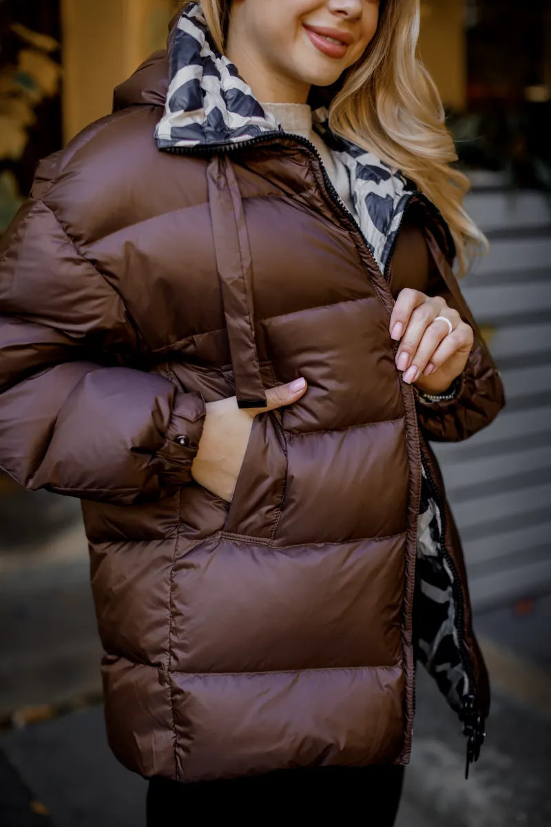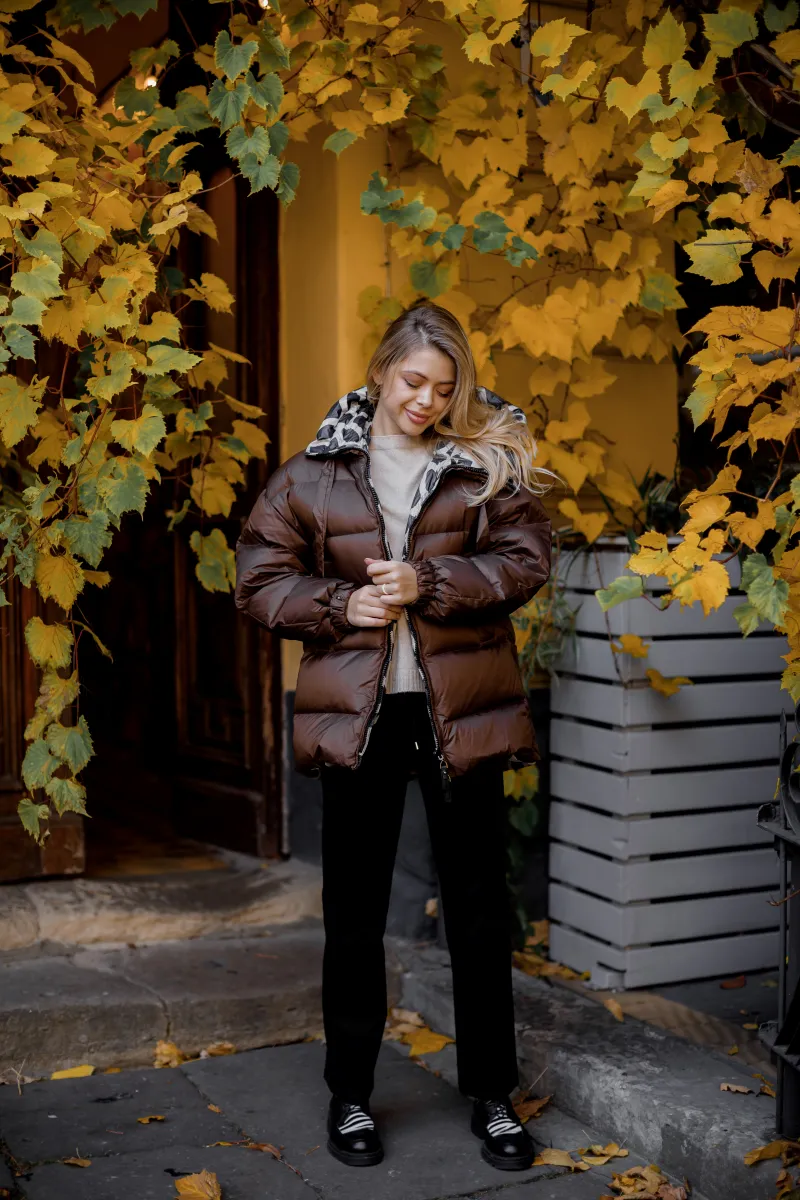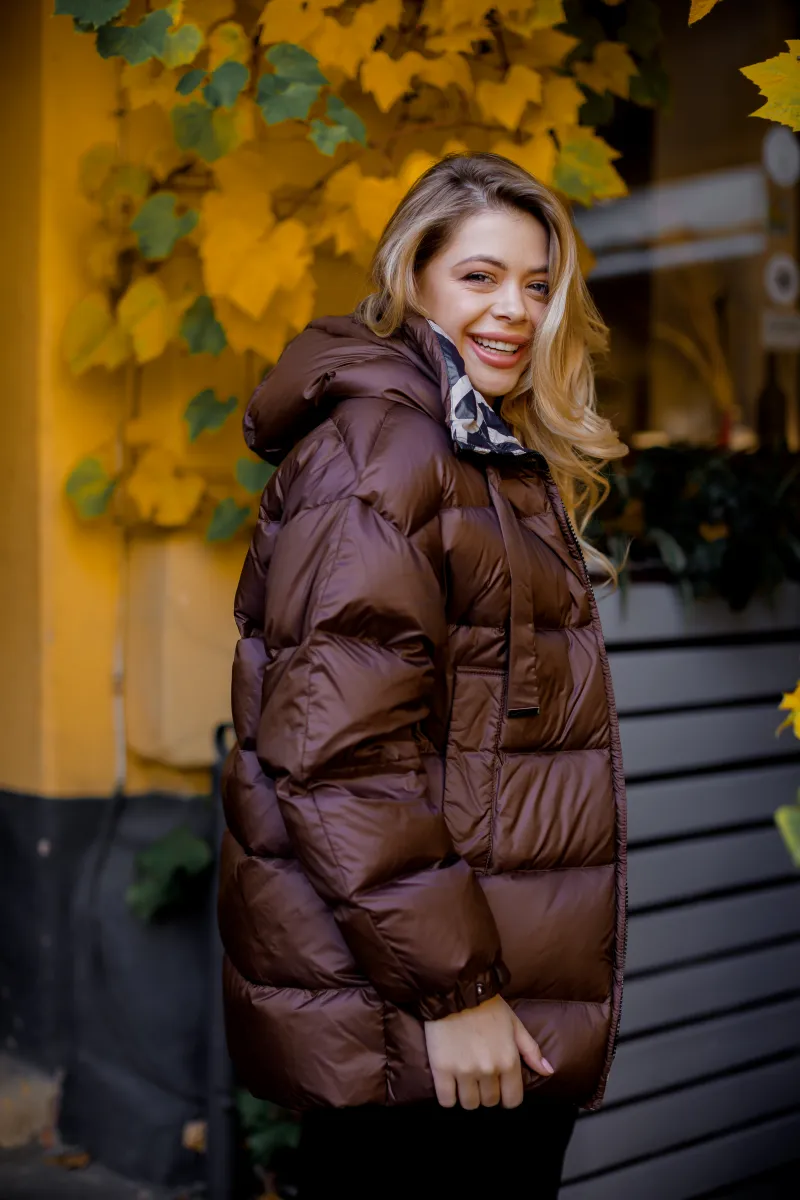 Демісезонна стьобана куртка з об'ємним капюшоном, наповненням з пуху та пера, представлена в чорному, шоколадному і бежевому кольорах.