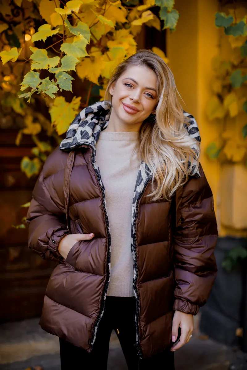 Модель: Стьобана укорочена куртка з об'ємним капюшоном та внутрішнім візерунком