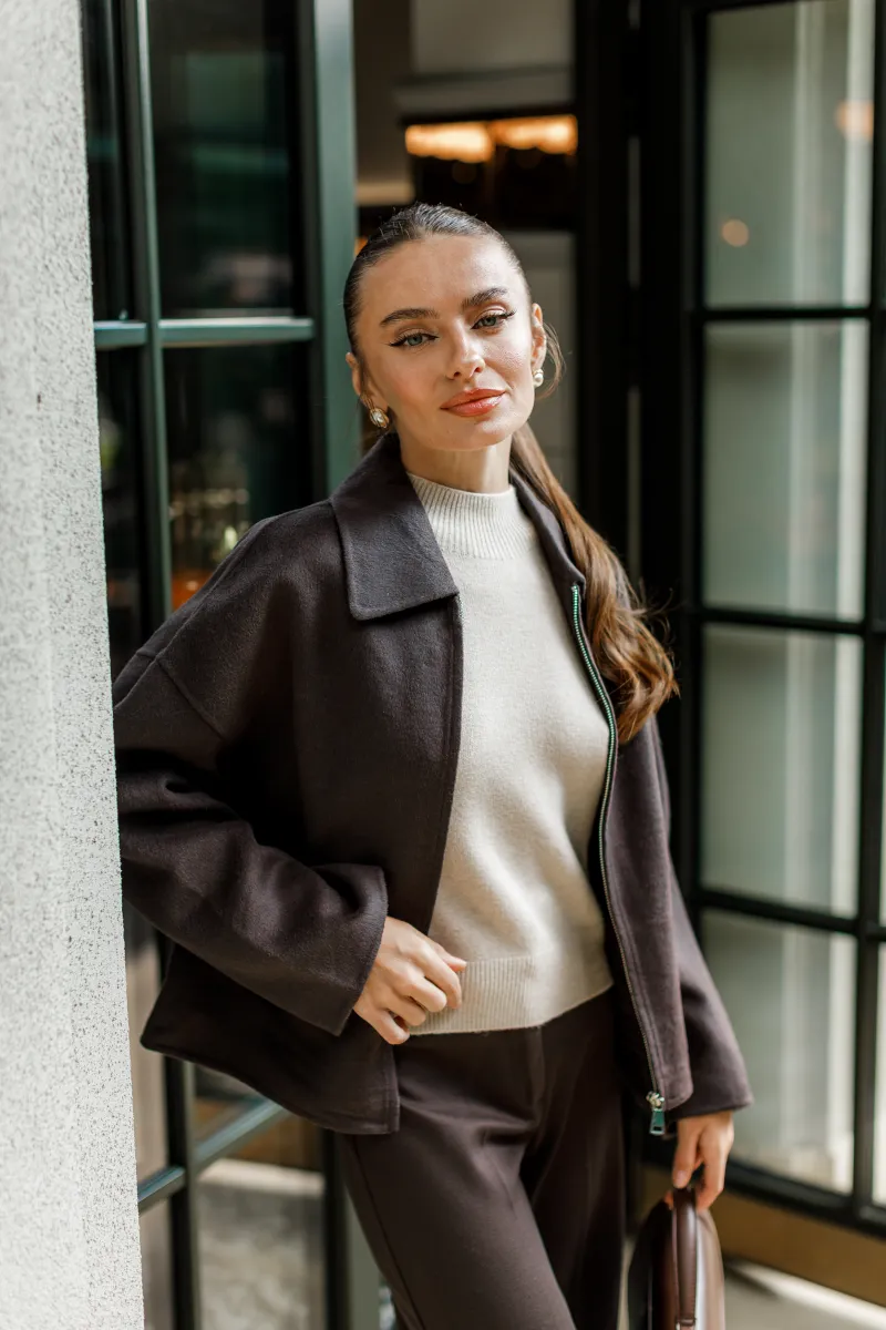 Жакет прямого силуету у глибокому шоколадному кольорі. Мінімалістичний дизайн, універсальна довжина, рукави вільного крою.