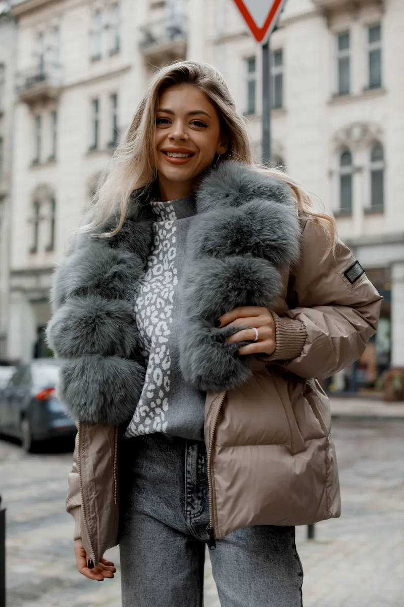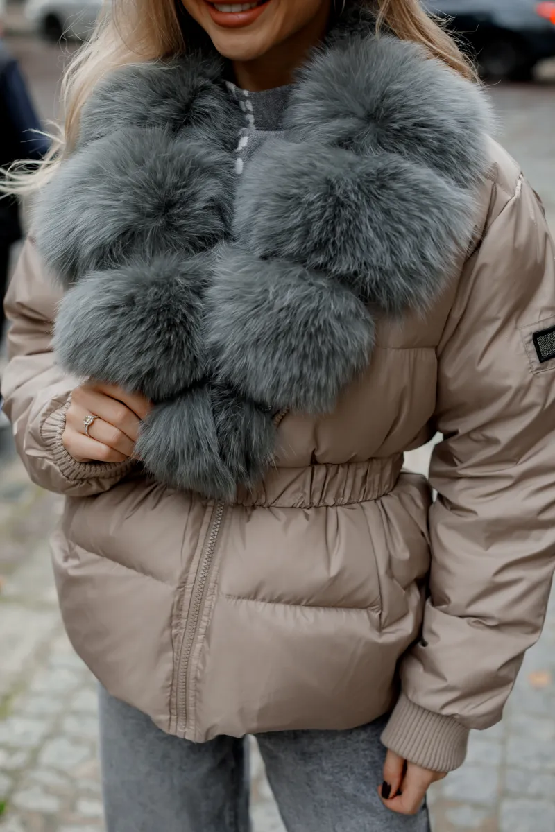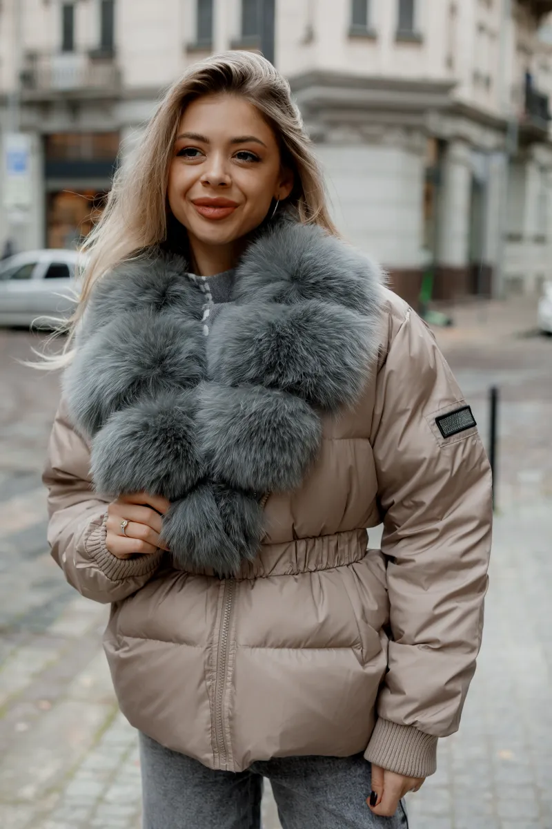 Вирізняється розкішним знімним коміром з хутра сірого кольору, який додає елегантності образу та дає можливість створювати різні варіанти стилізації.