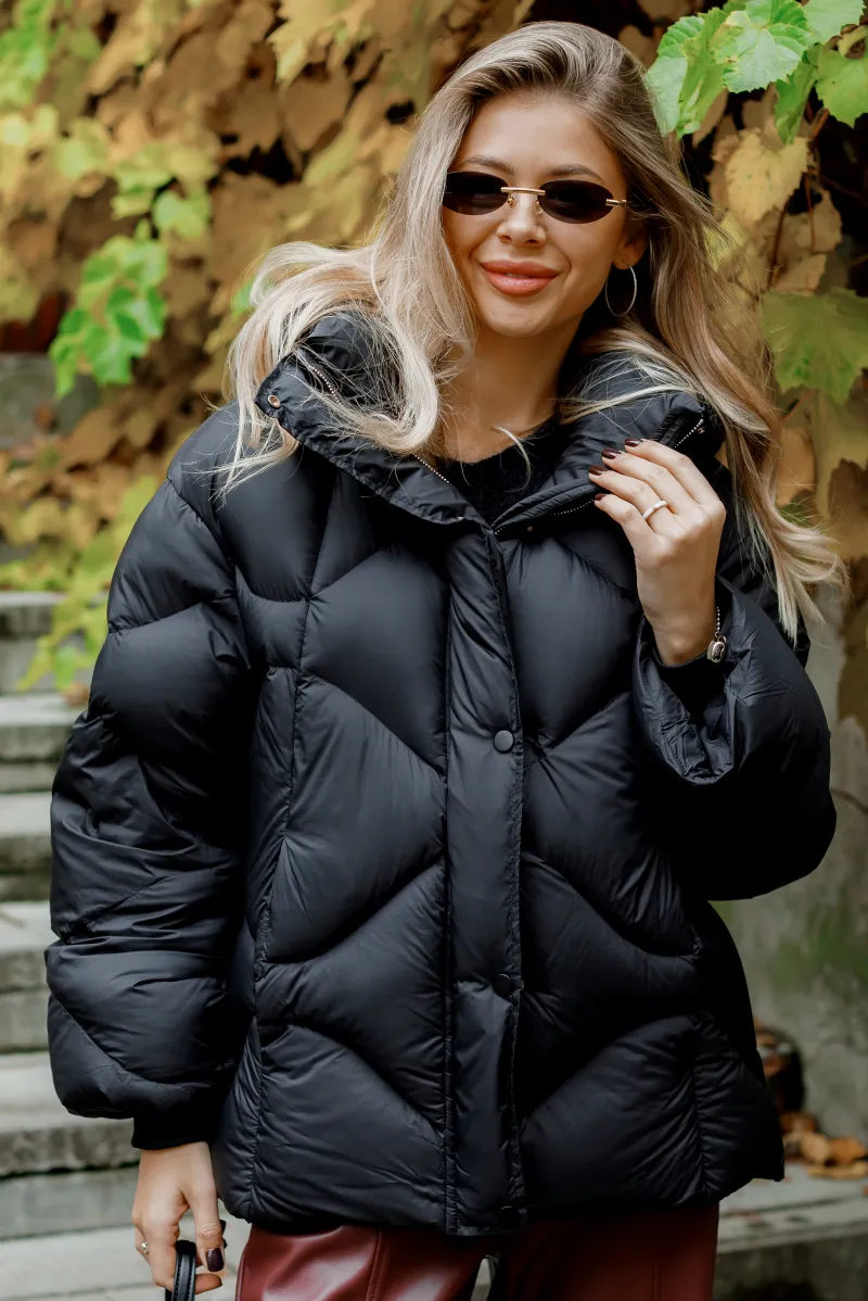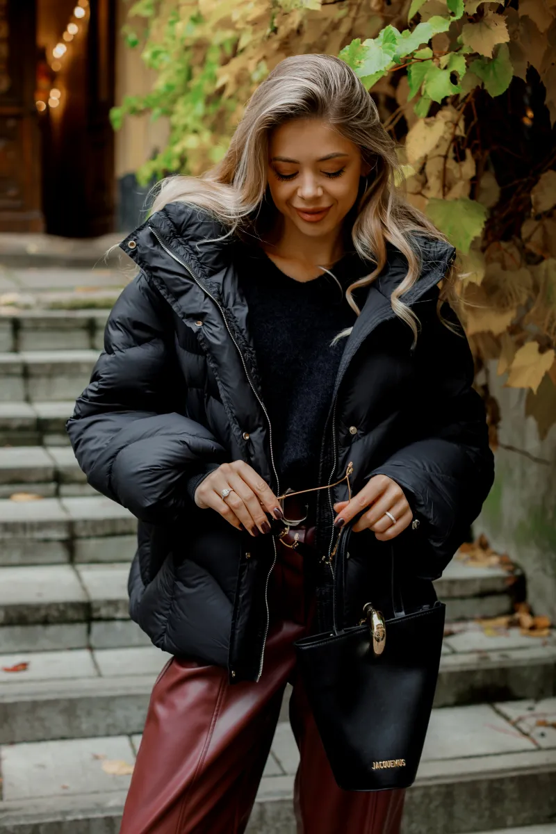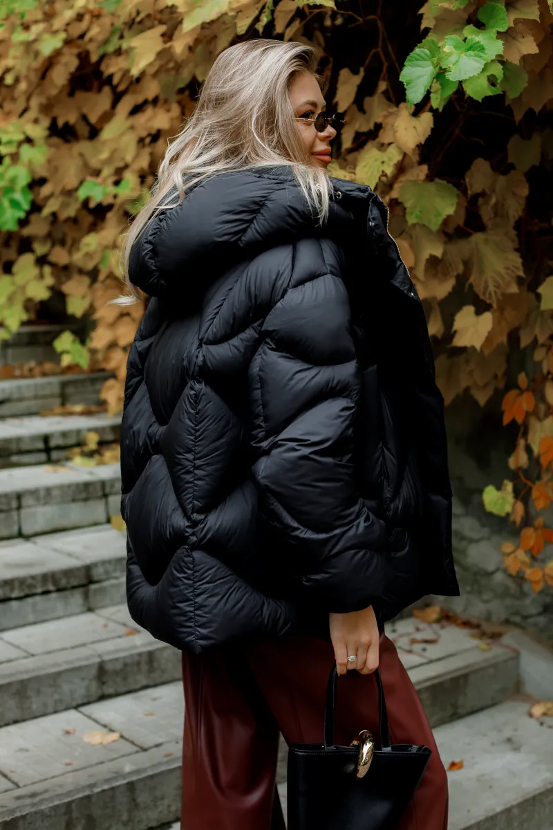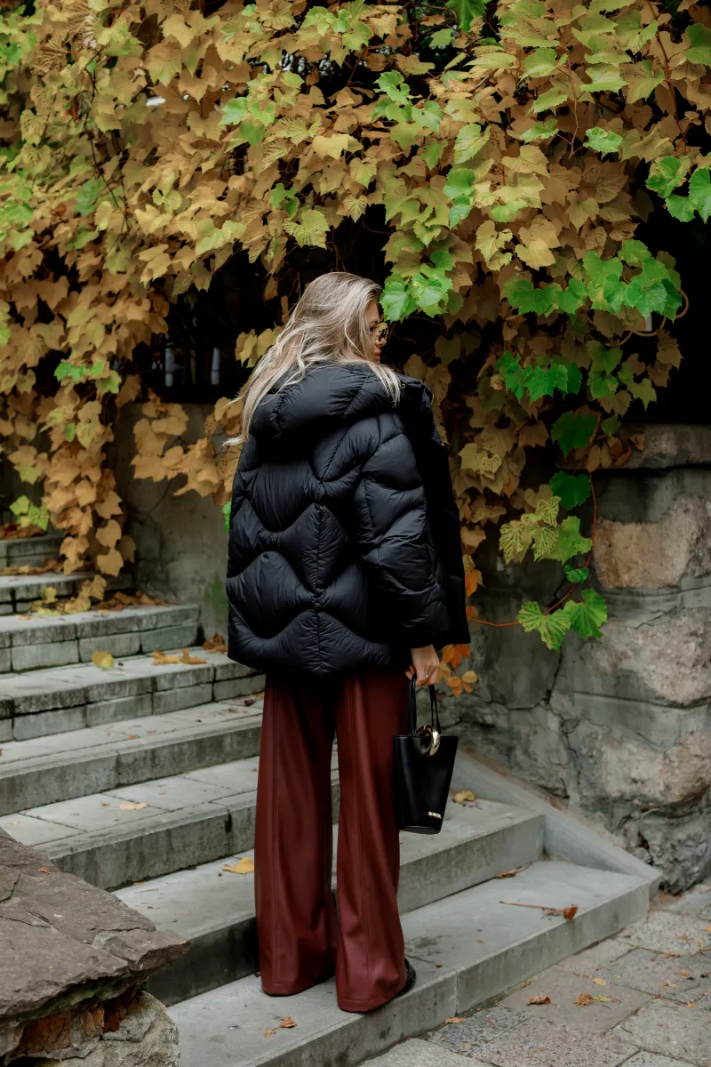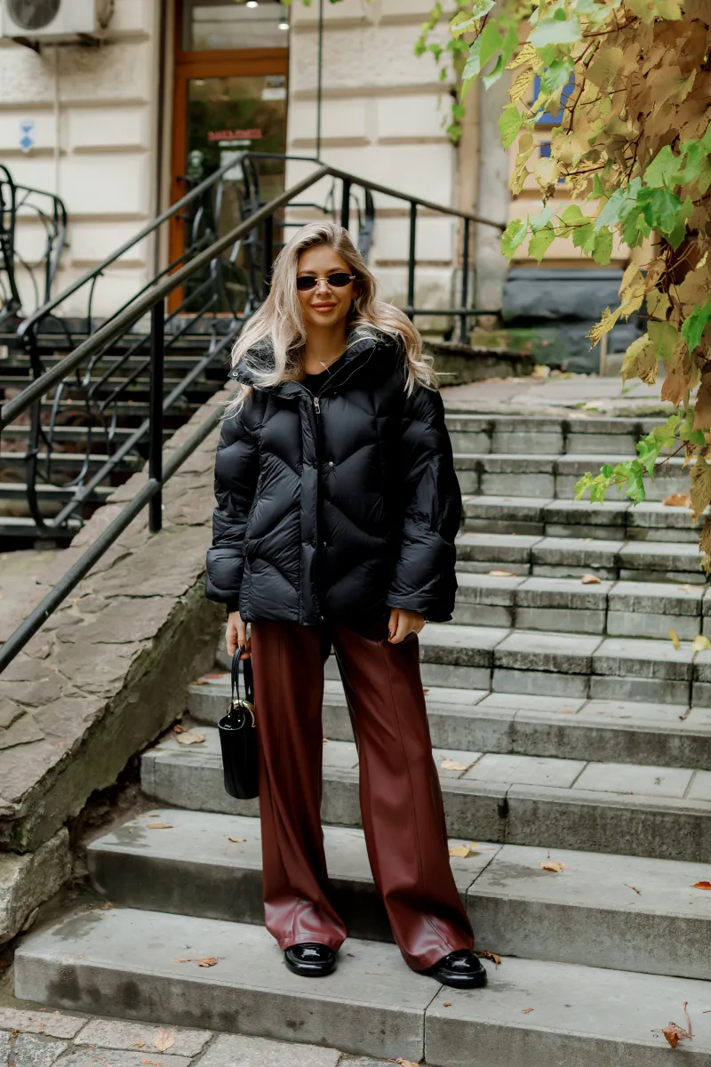 Обʼємна пухова куртка з капюшоном. Прямий крій, застібка на кнопки та блискавку, фігурна прострочка. Наповнювач — натуральний лебединий пух.