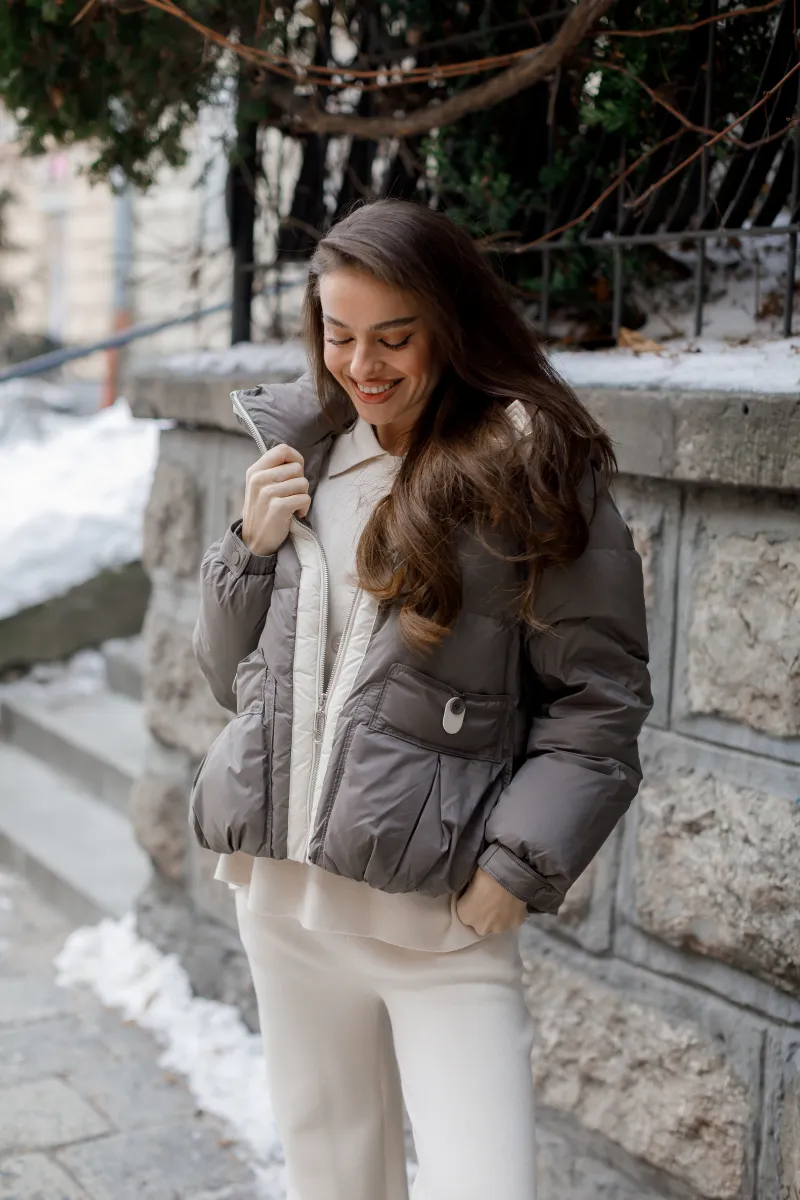 Об’ємний капюшон захищає від вітру та снігу, а поєднання нейтральних відтінків надає моделі елегантного й сучасного вигляду.