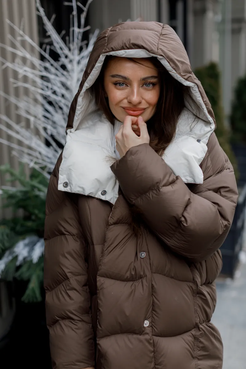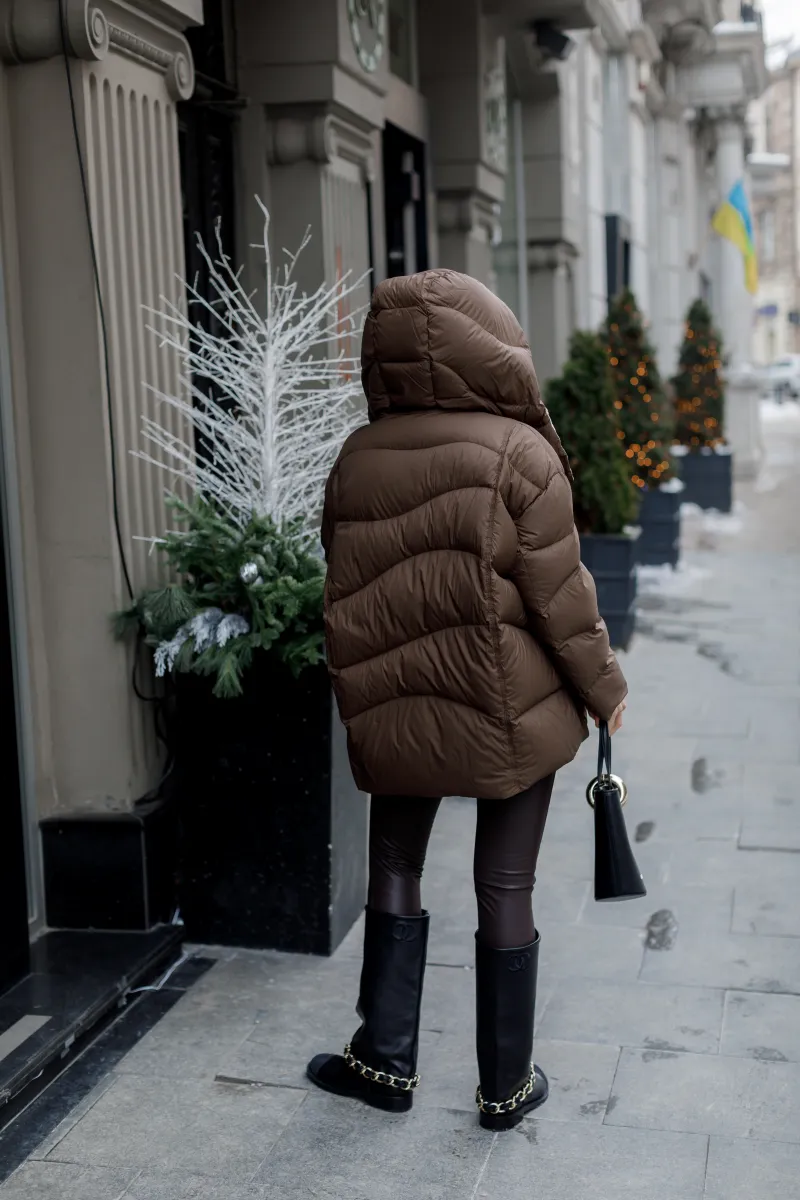 Об’ємний капюшон додатково захищає від вітру та холоду, створюючи відчуття затишку, а м’яка посадка приємно огортає силует.