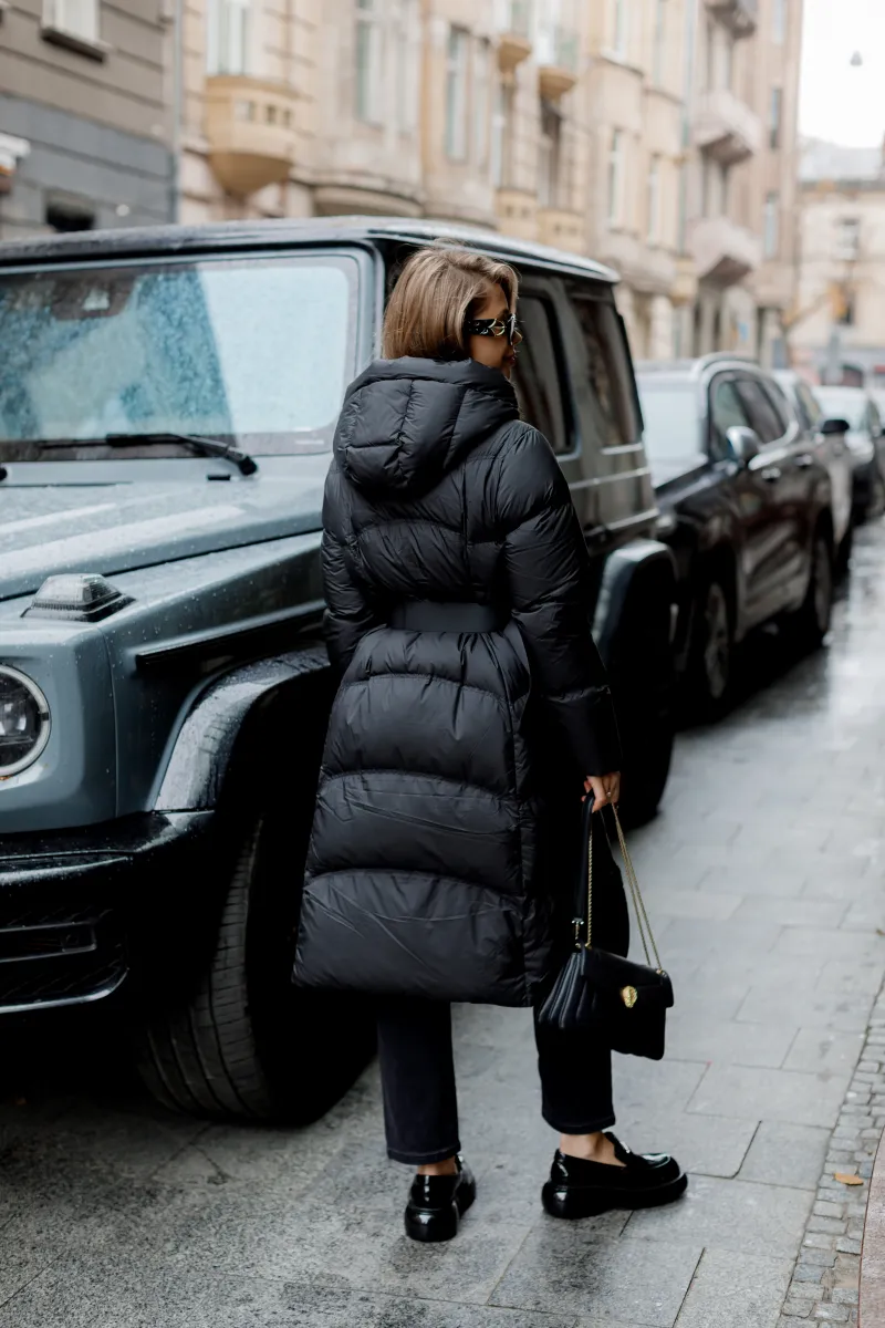 Об’ємний довгий пуховик із поясом у чорному кольорі з натуральнип наповненням