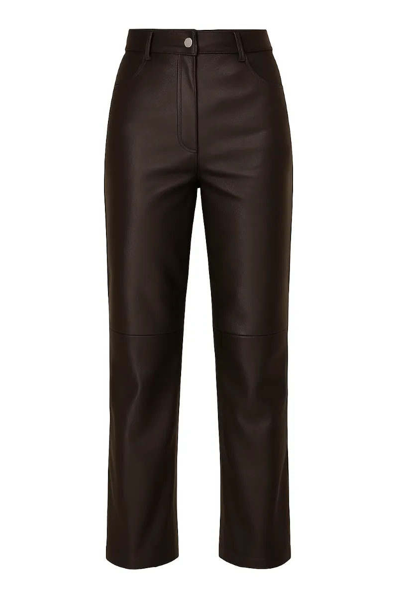 Стильні штани прямого крою з преміальної пресованої екошкіри французького виробництва в глибокому відтінку гарячого шоколаду.