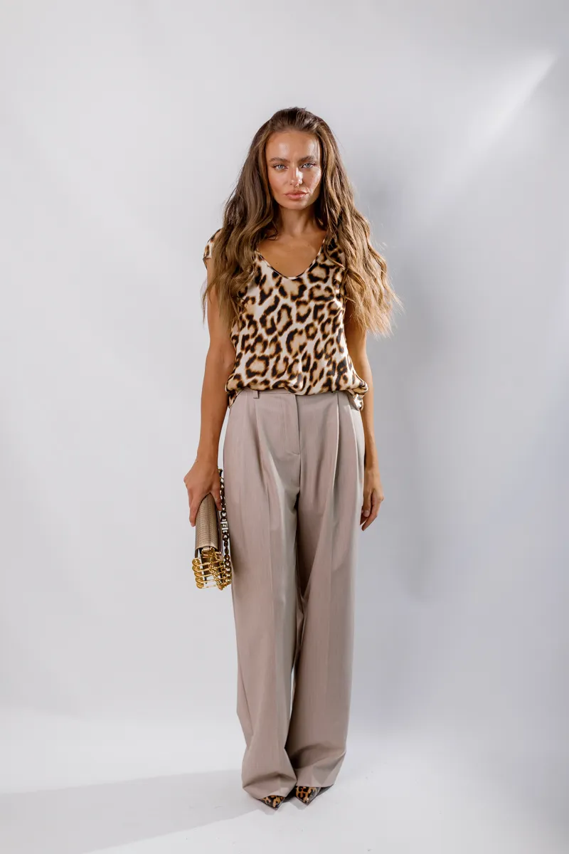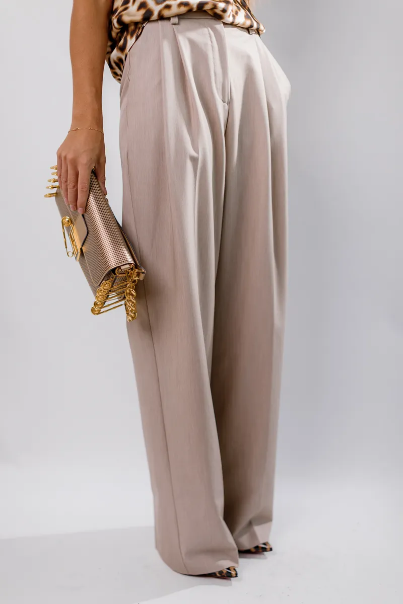 Бежеві брюки від Imperial – це поєднання класики і сучасності, що робить їх незамінним елементом гардеробу. Вони виготовлені з високоякісного матеріалу, який відрізняється м'якістю та комфортом, а їх вільний крій додає свободи рухів, забезпечуючи при цьому стильний і елегантний вигляд. Брюки мають високий пояс, що підкреслює талію, та акуратні складки, які додають образу структурованості. Вони легко поєднуються як із класичними, так і з більш неформальними речами, дозволяючи створювати різноманітні образи для будь-яких подій – від офіційних зустрічей до повсякденних прогулянок.